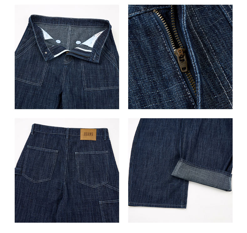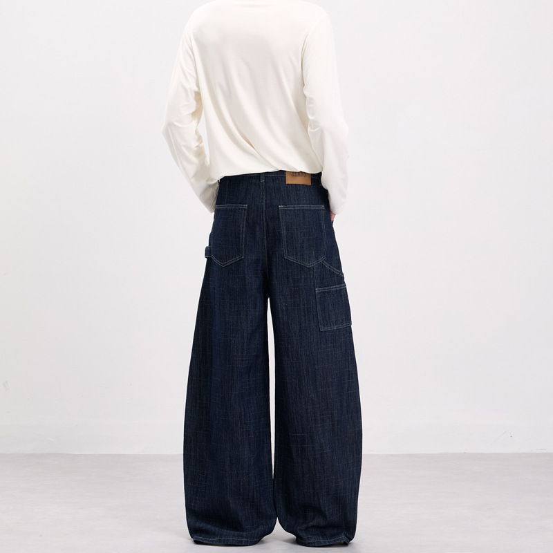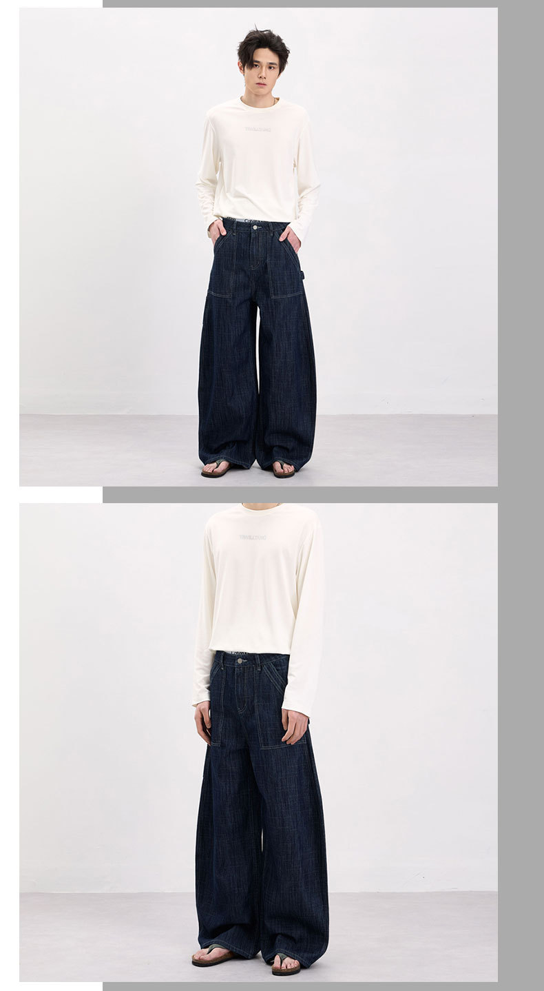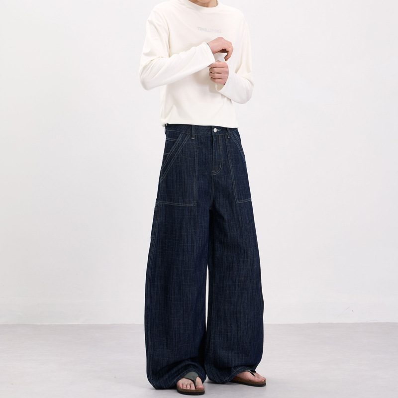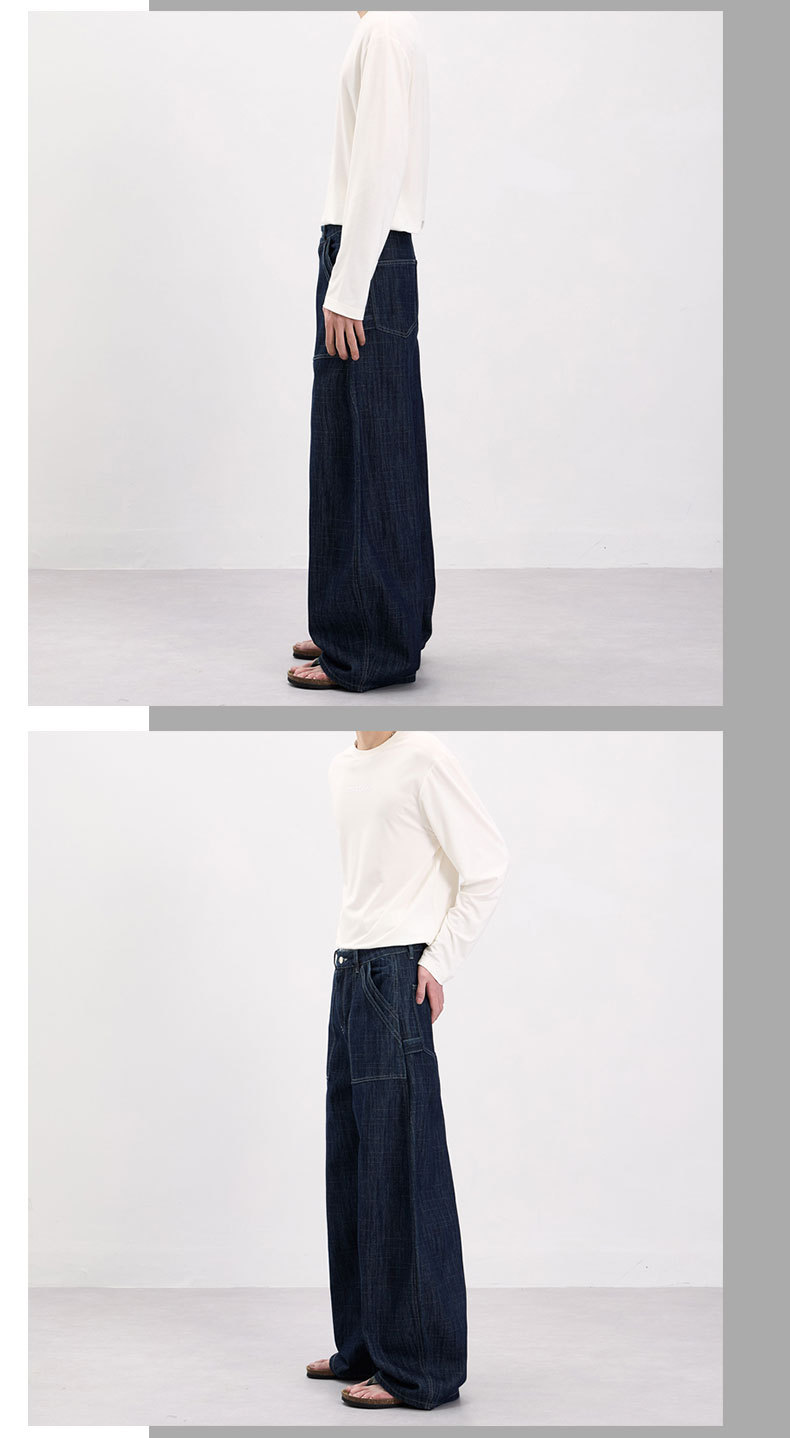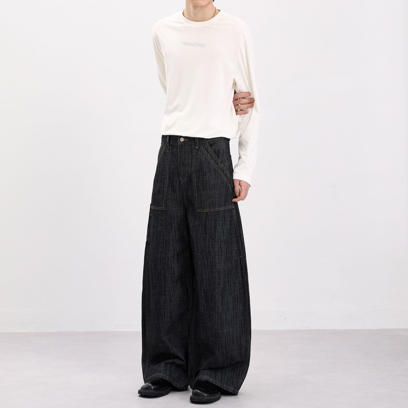 LKTM男装 美式复古风横竖竹节纹弯刀牛仔裤男女baggy设计感工装裤