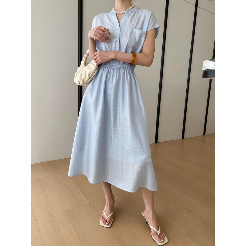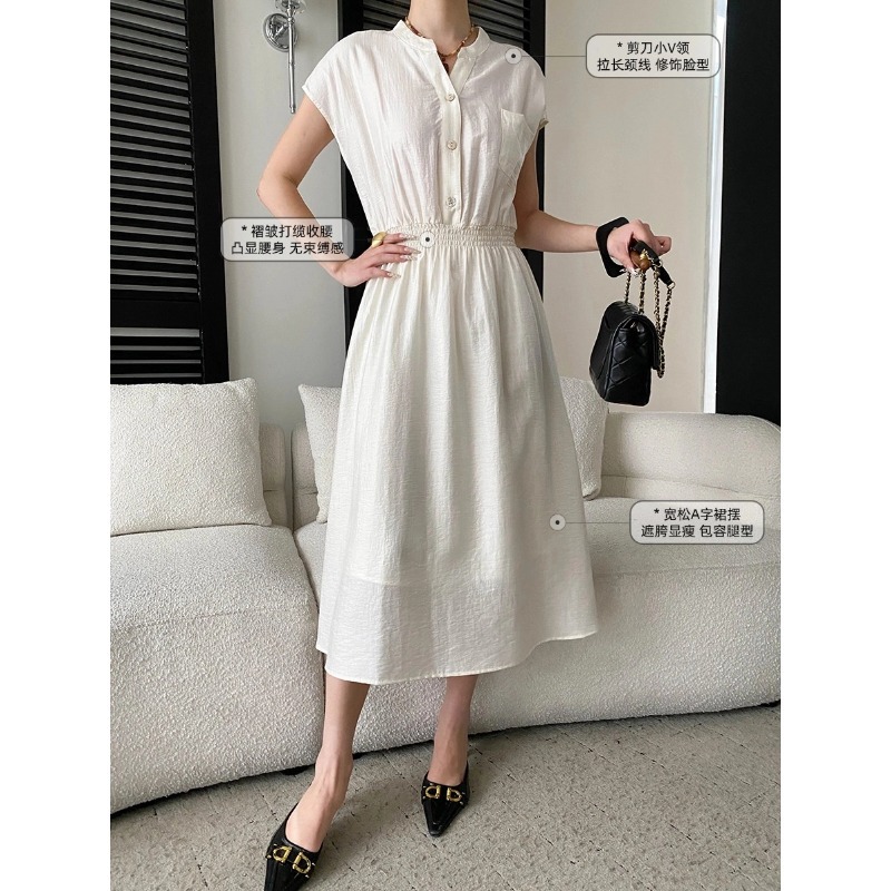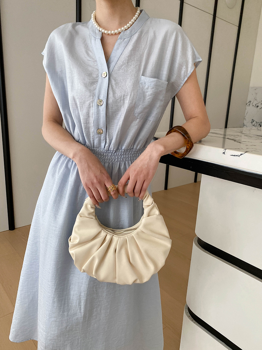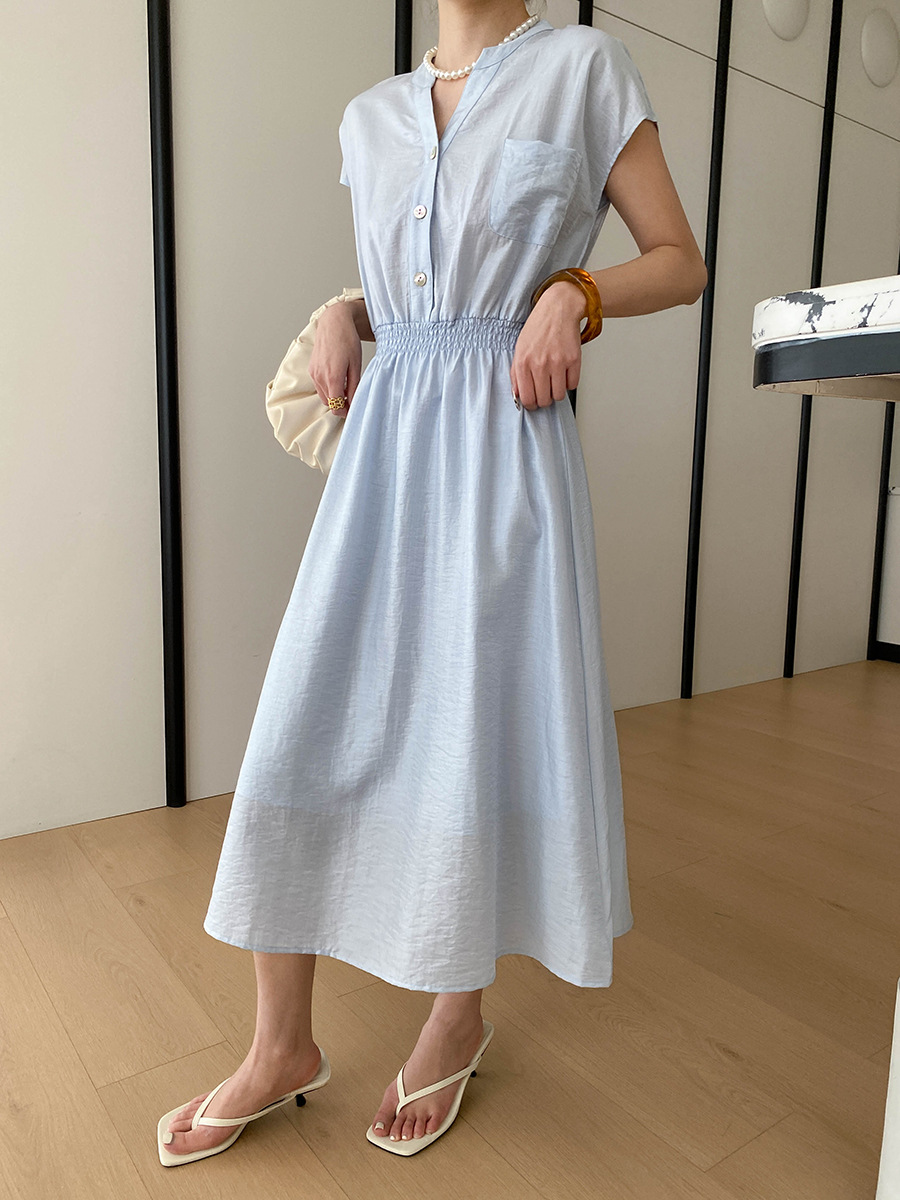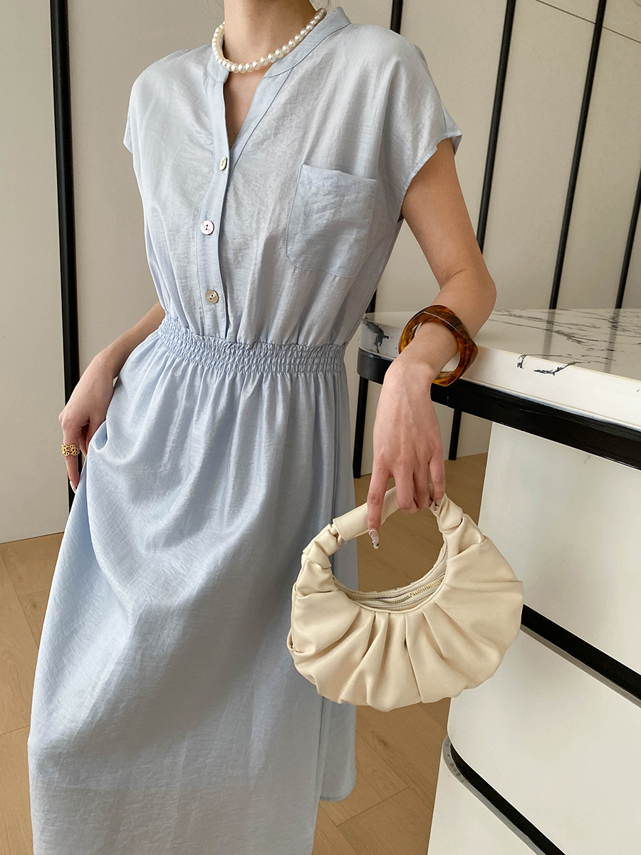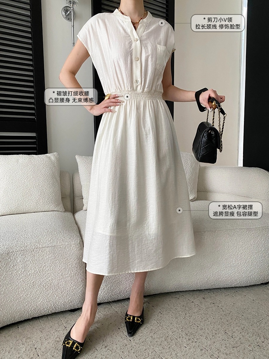 司南淡人通勤醋酸天丝混纺剪刀V领褶皱打缆收腰连衣裙