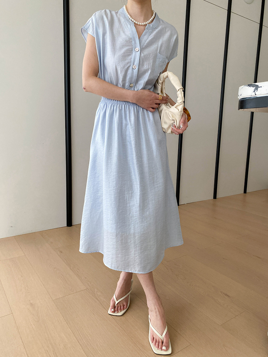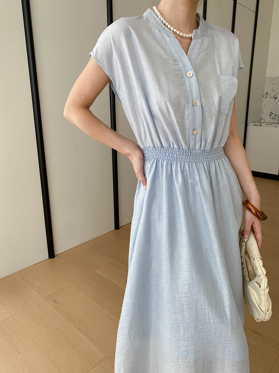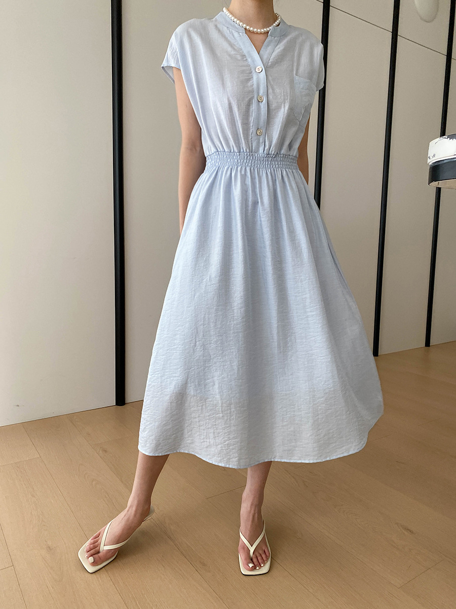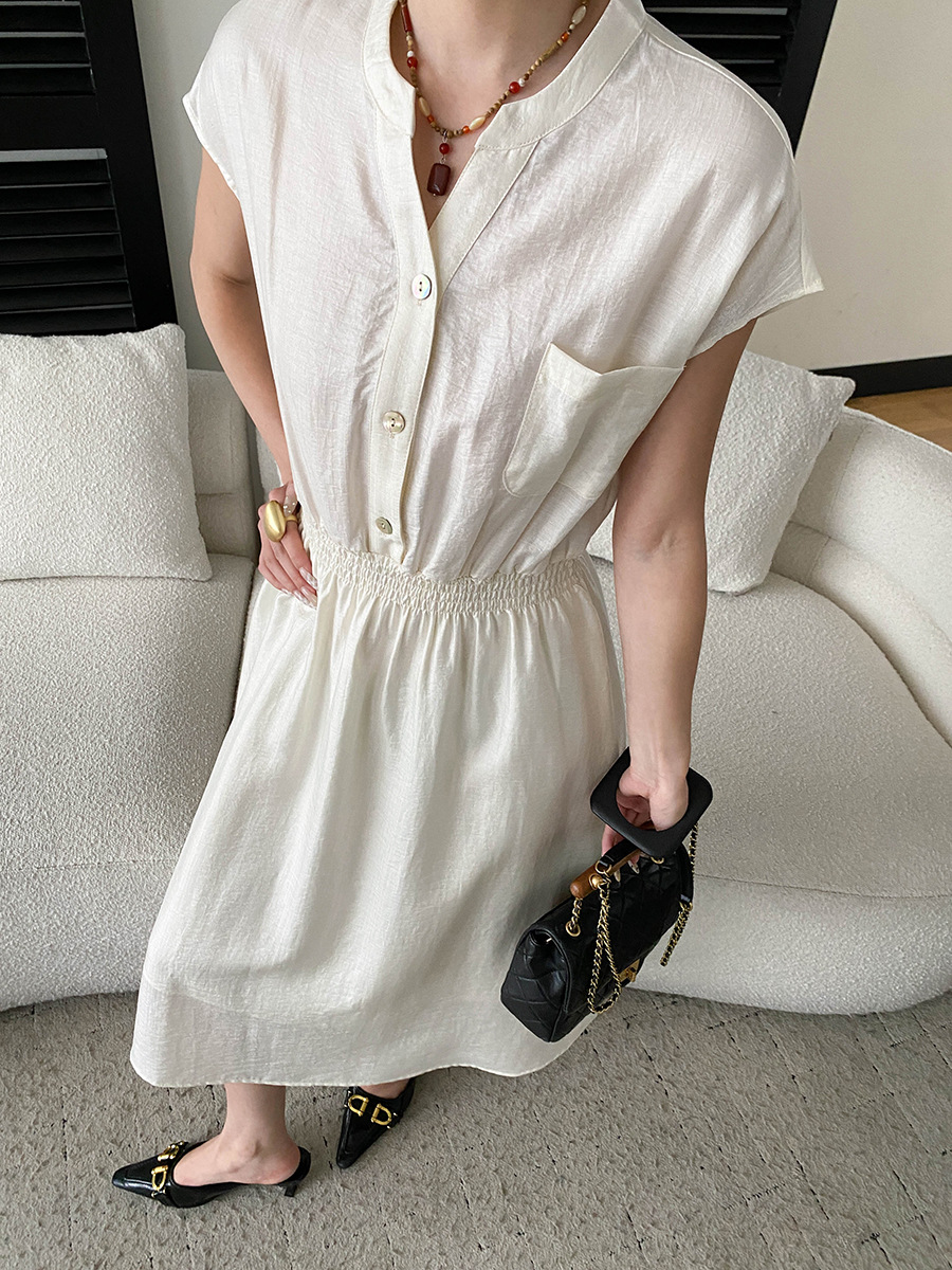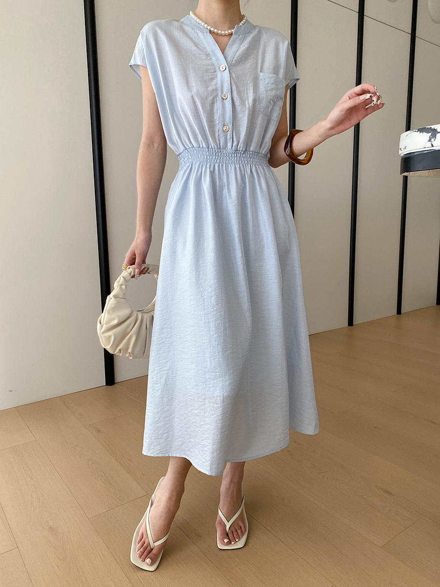 司南淡人通勤醋酸天丝混纺剪刀V领褶皱打缆收腰连衣裙