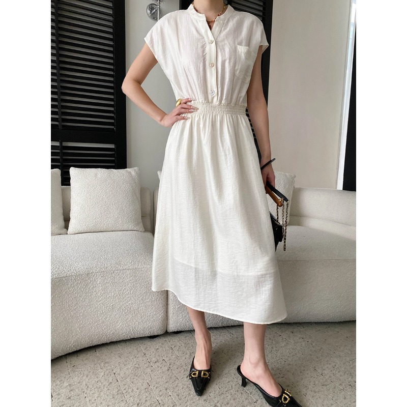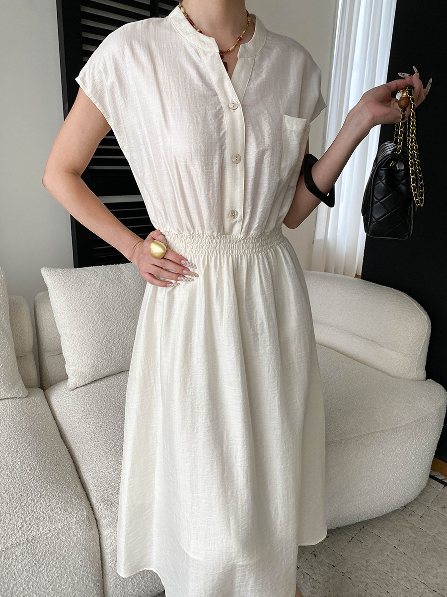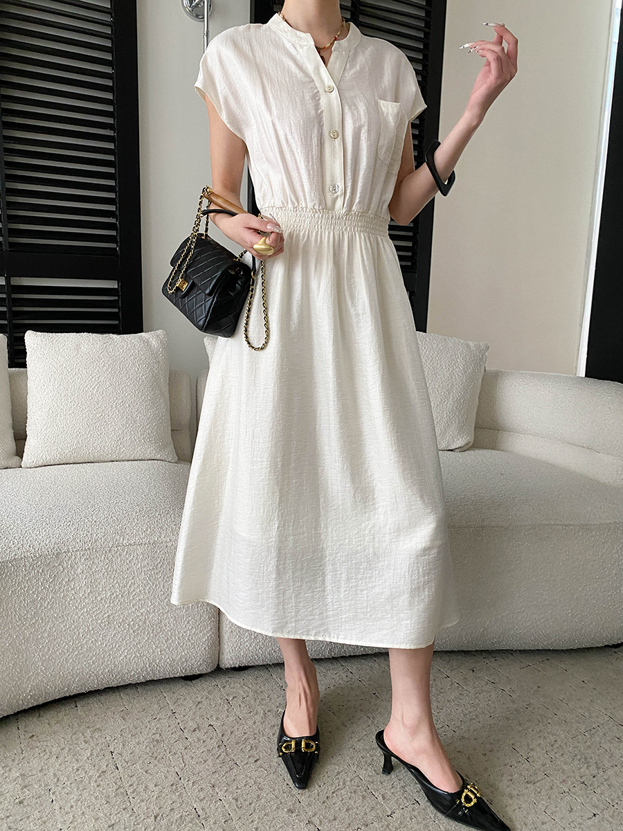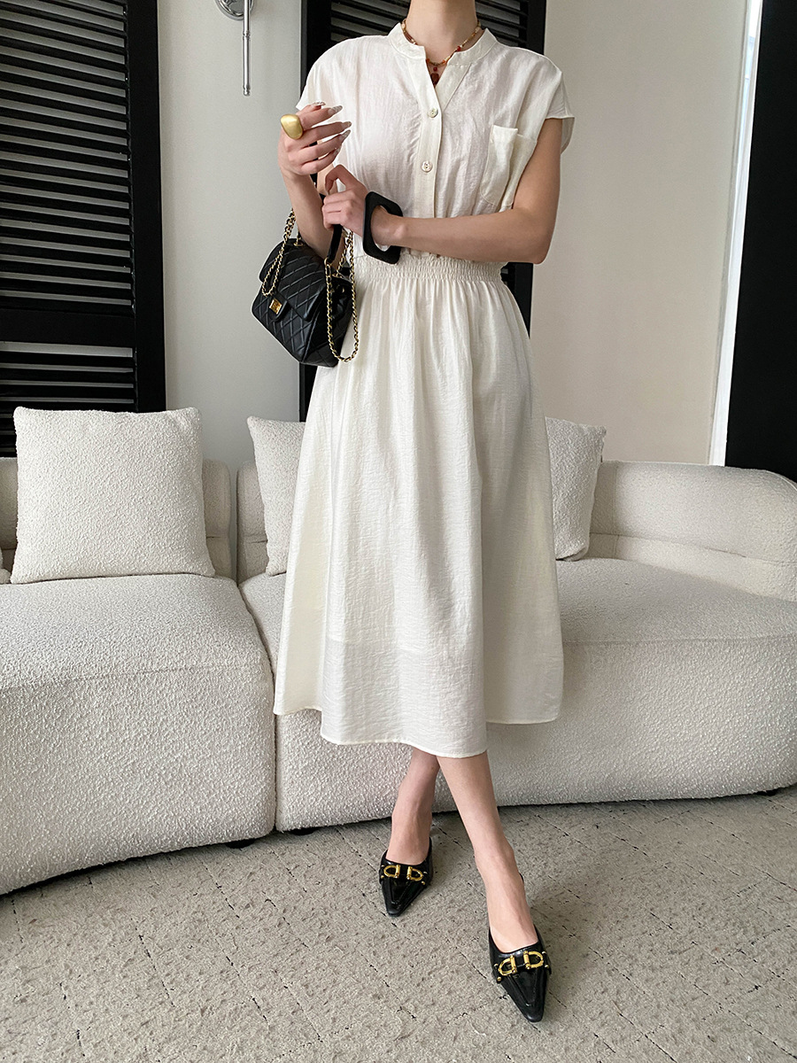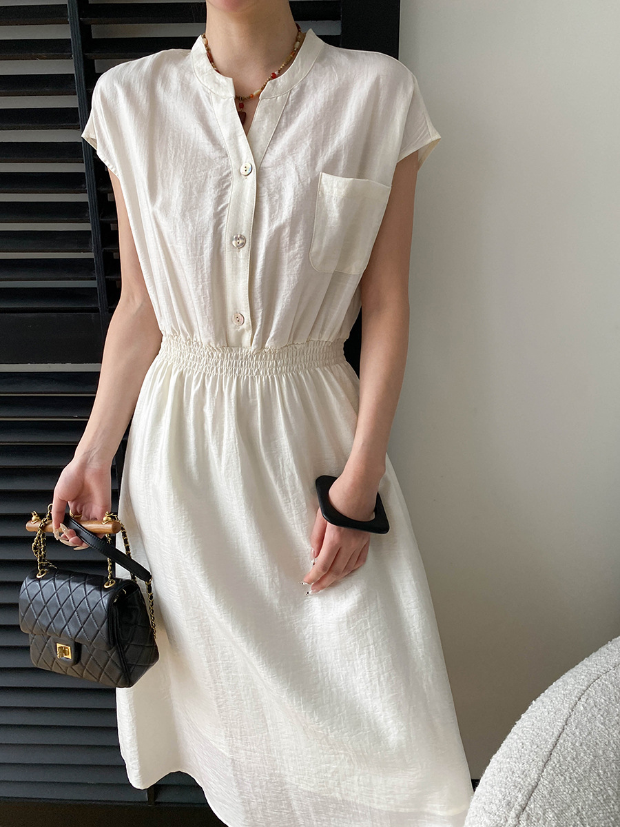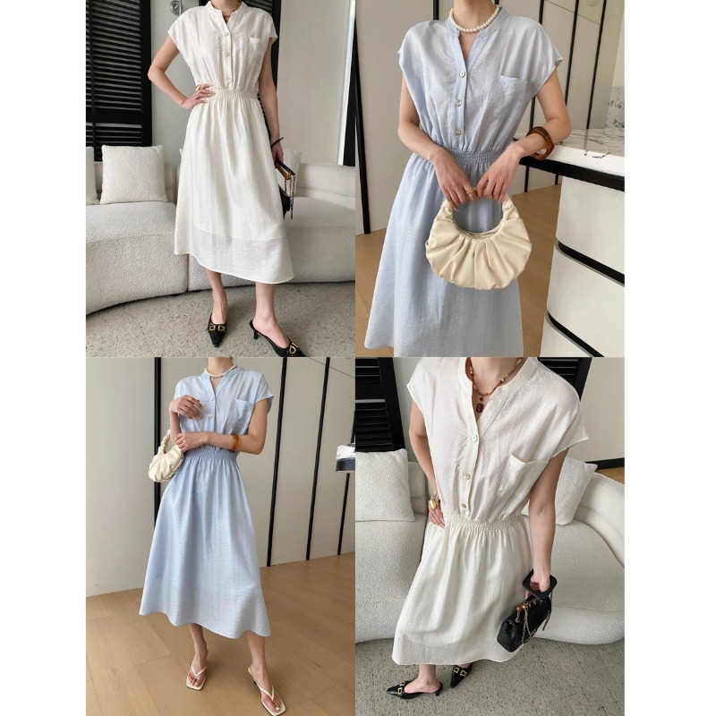 司南淡人通勤醋酸天丝混纺剪刀V领褶皱打缆收腰连衣裙
