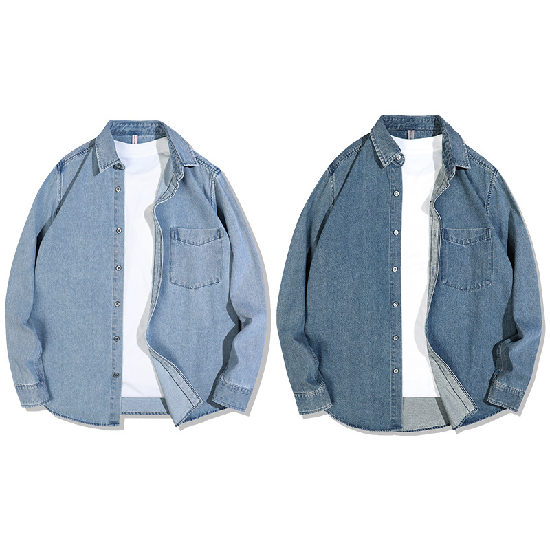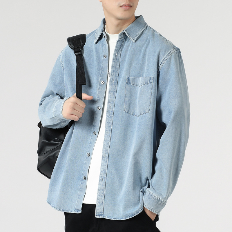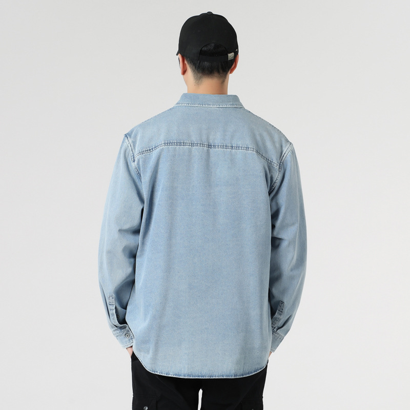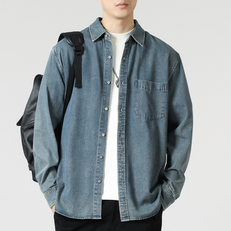 LKTM男装#春季新款日系复古水洗牛仔衬衫男工装长袖衬衣外套