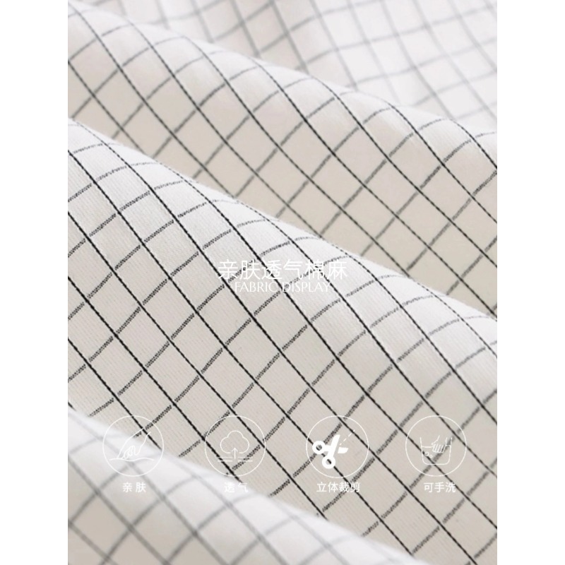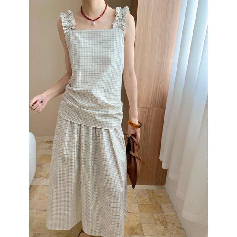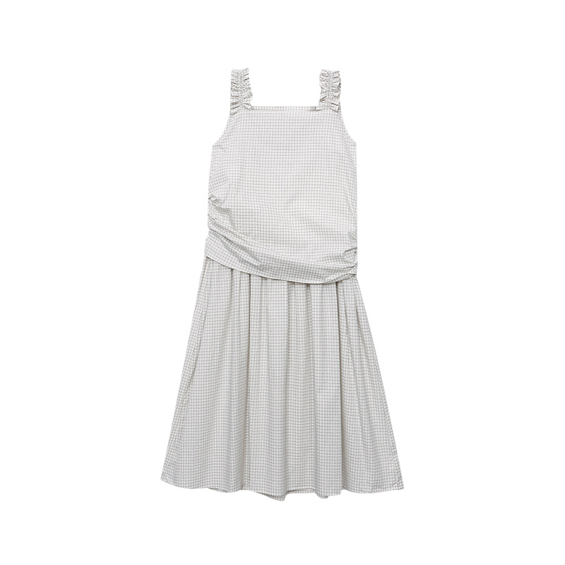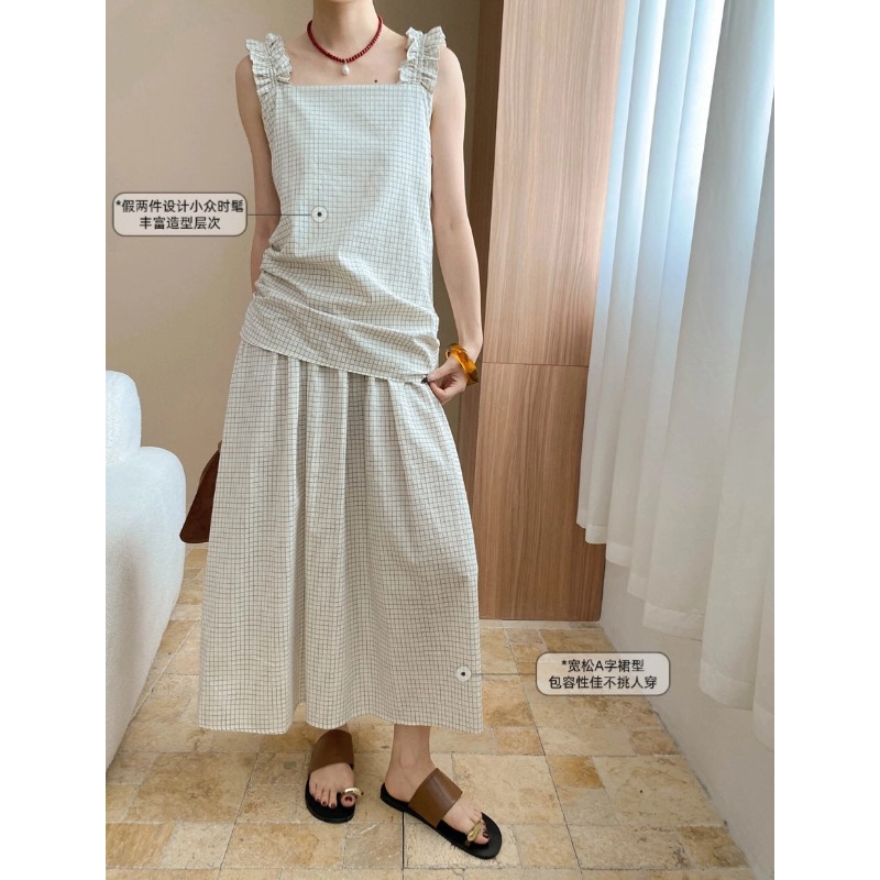 司南小众设计师款复古棉麻吊带假两件设计感格纹连衣裙