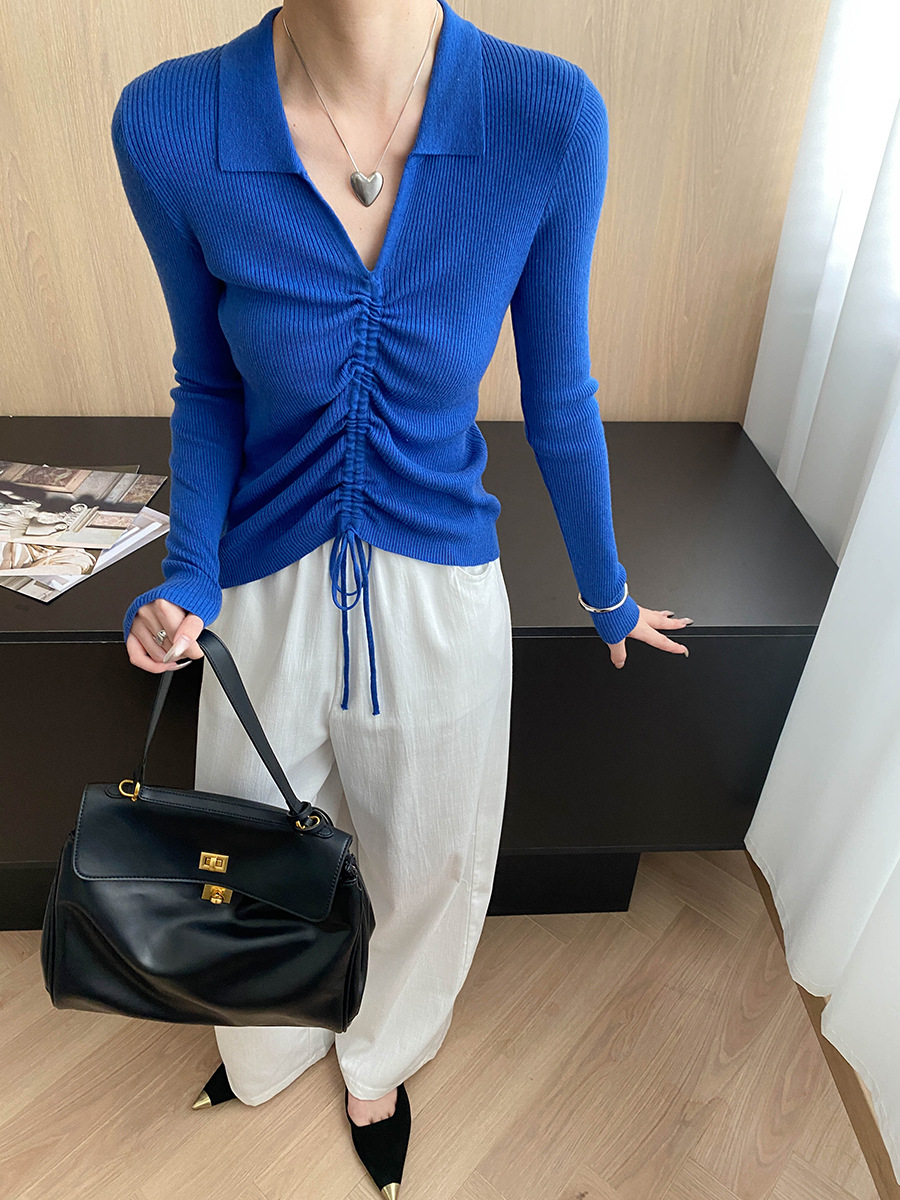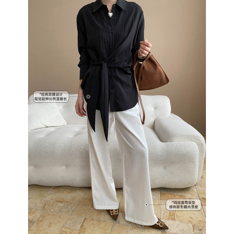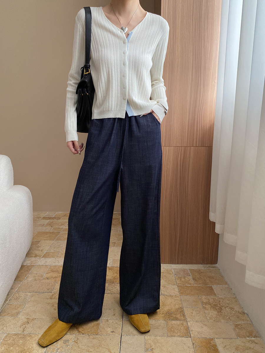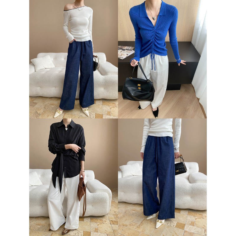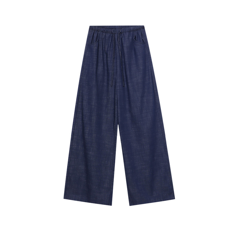 司南早秋新款亚麻混纺抽绳松紧高腰显瘦休闲牛仔阔腿裤