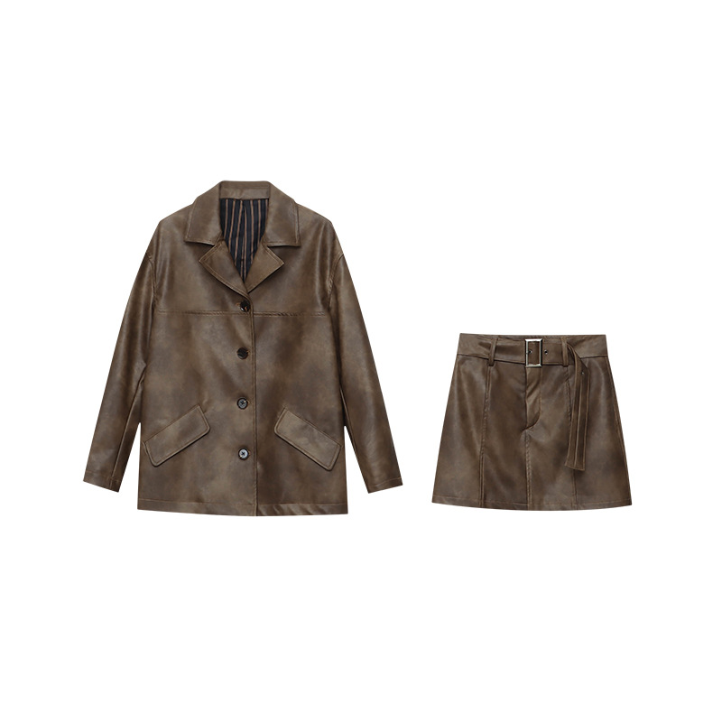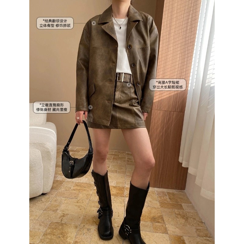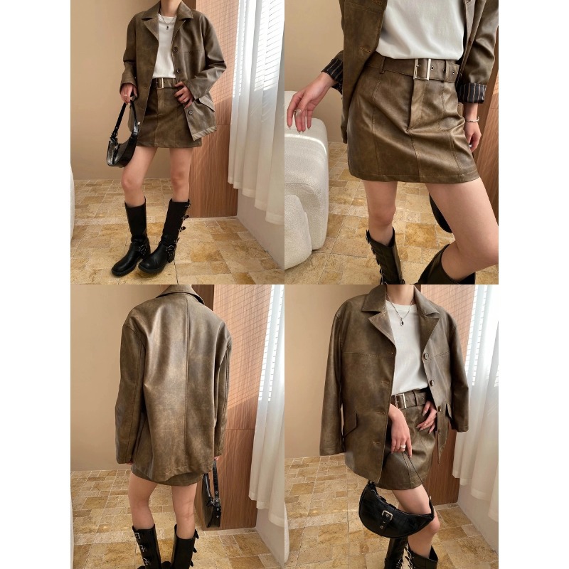 司南早秋新款中古斑驳做旧感PU皮衣西装外套半身裙套装
