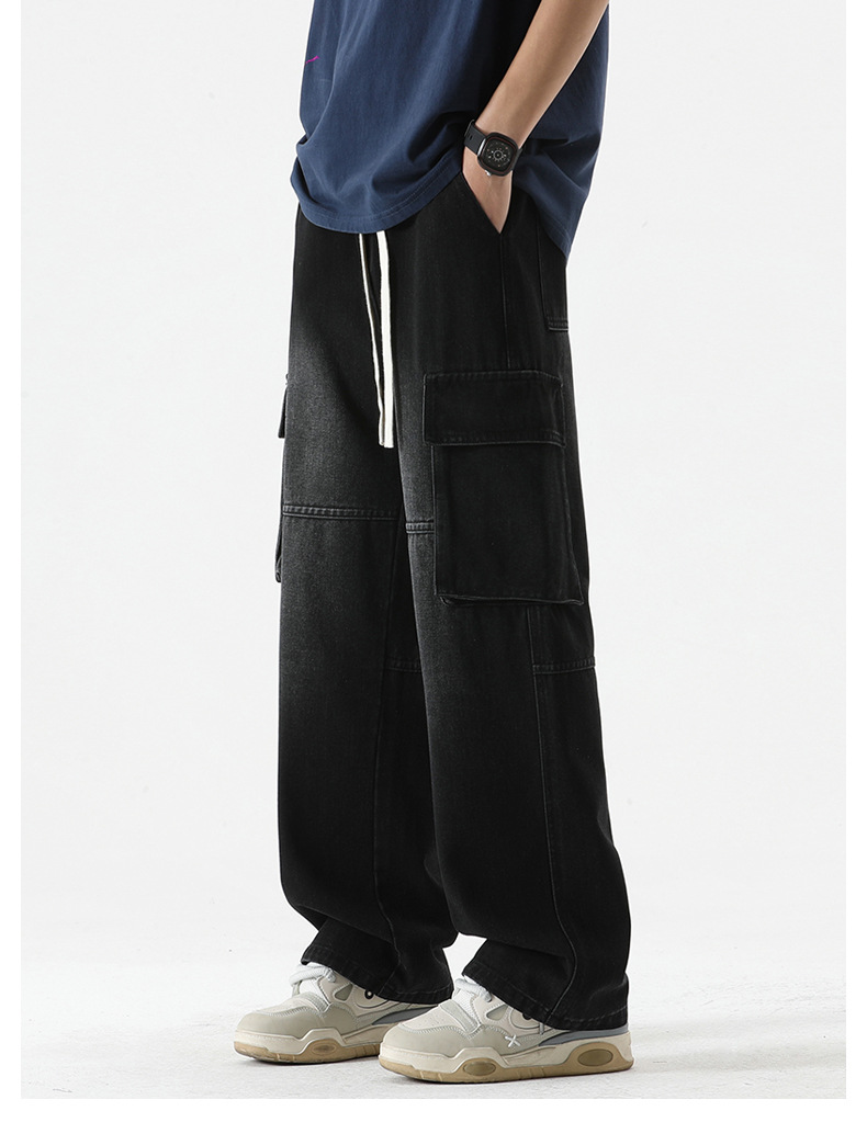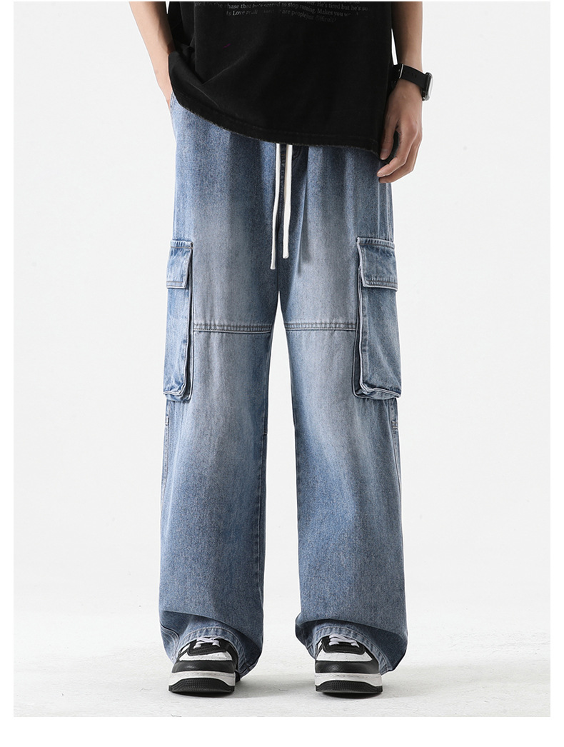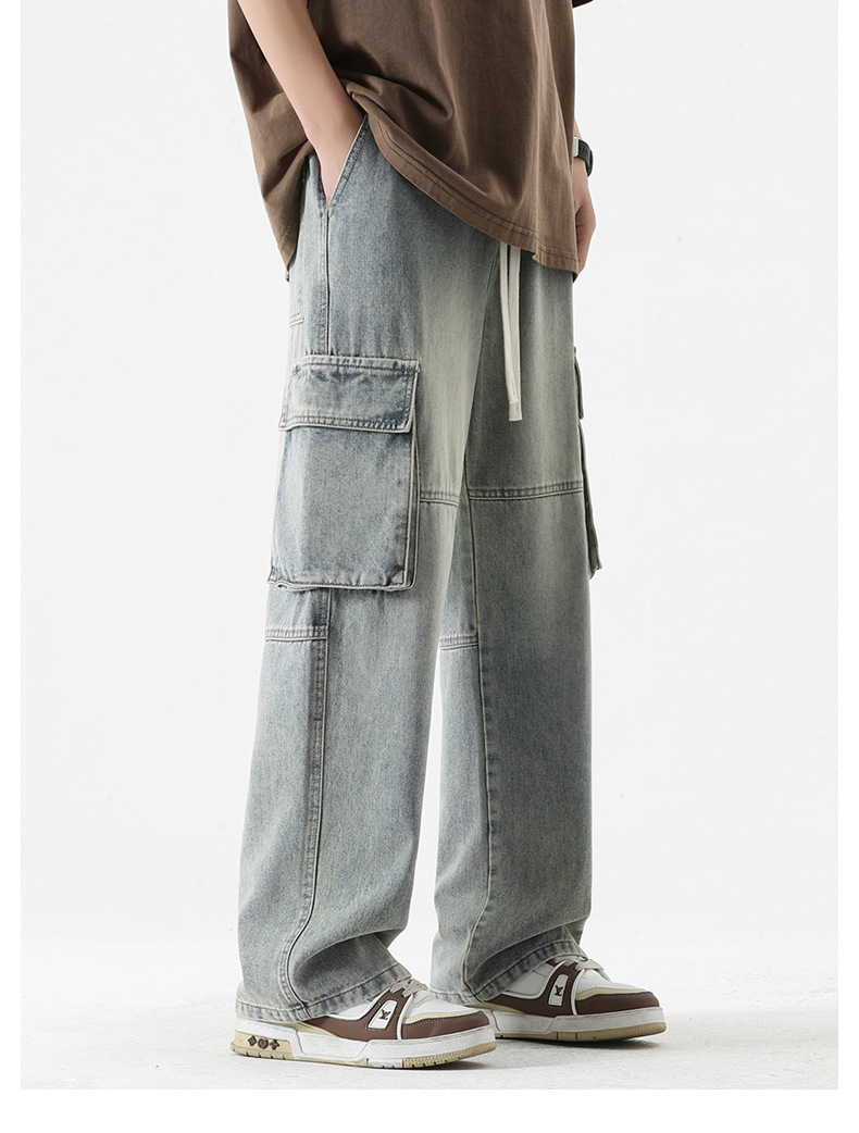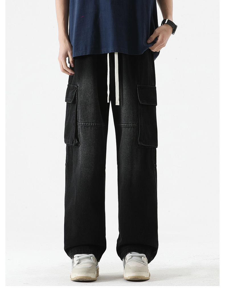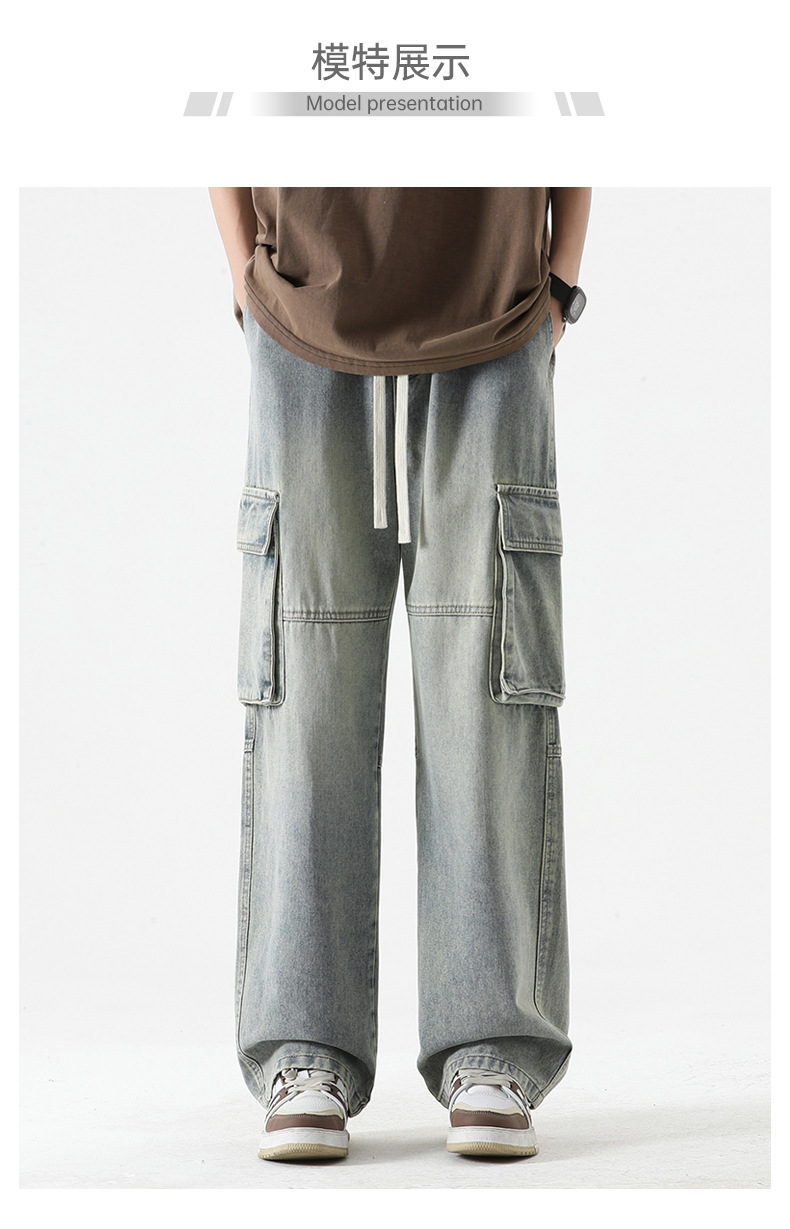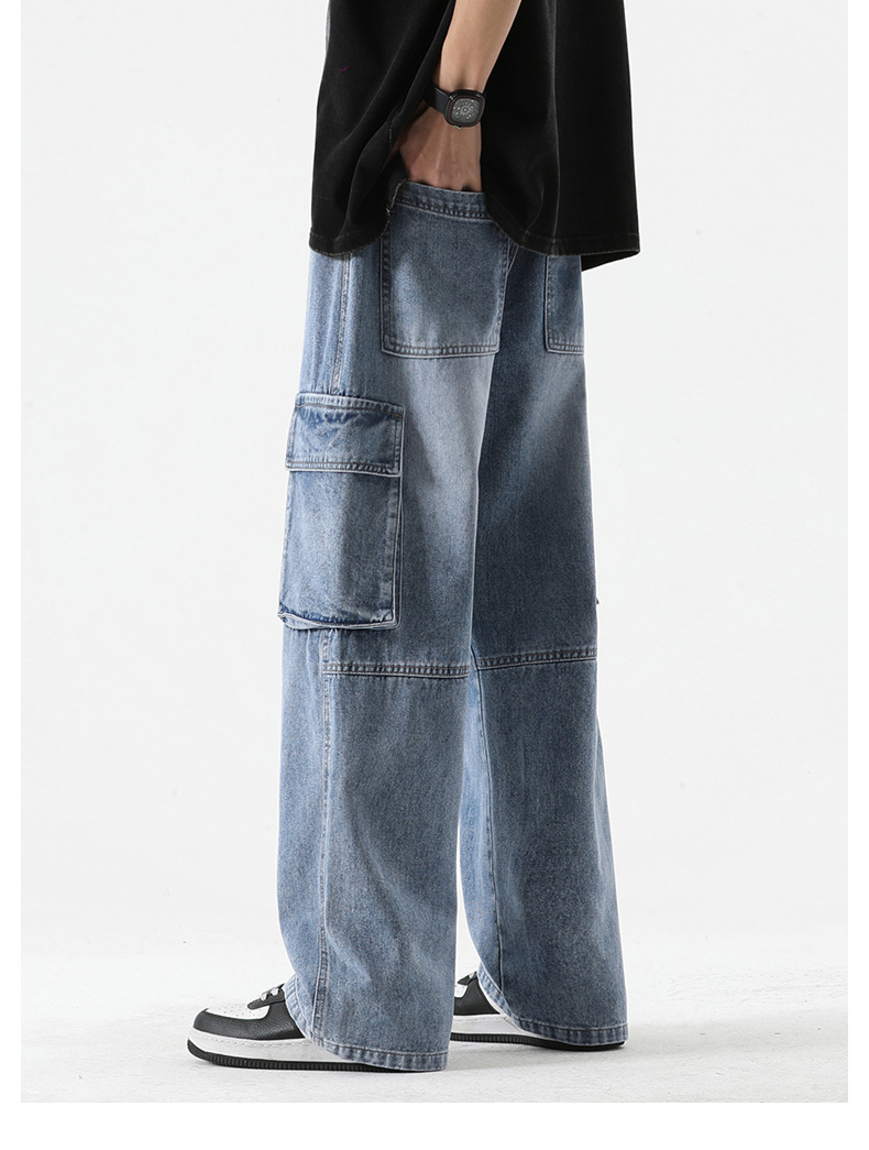 LKTM男装#日系复古多口袋拼接工装牛仔裤男ins潮牌宽松直筒阔腿裤