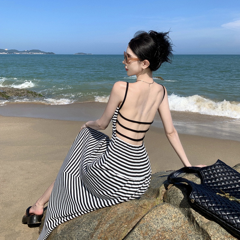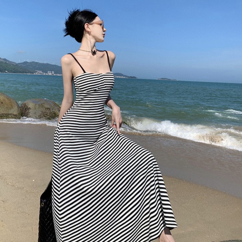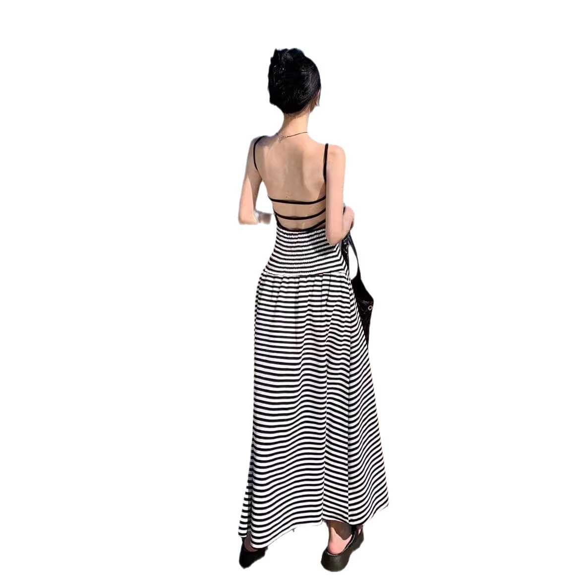 新款黑白条纹露背吊带连衣裙女夏季高腰超修身显瘦长裙