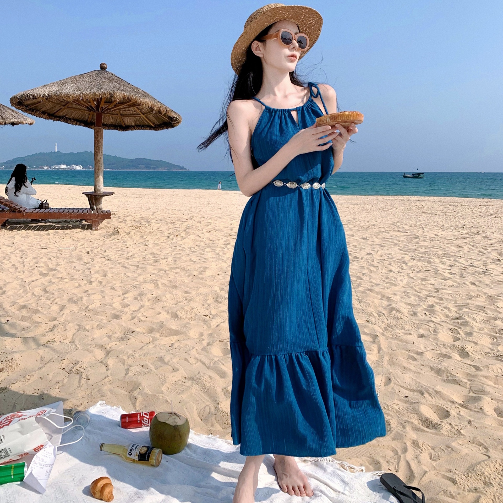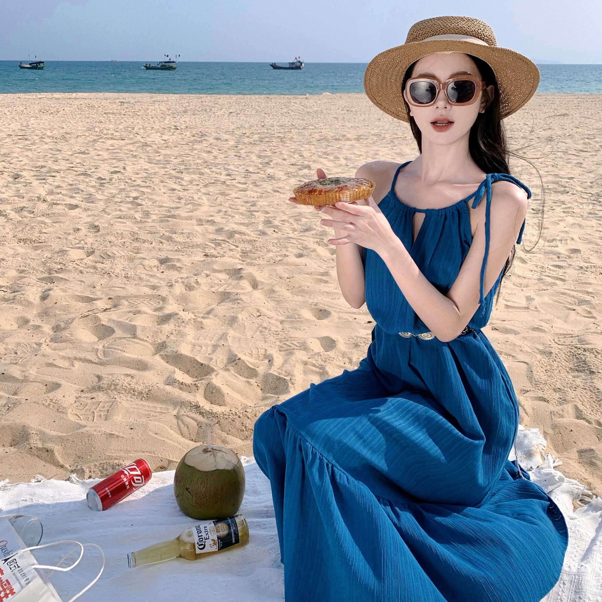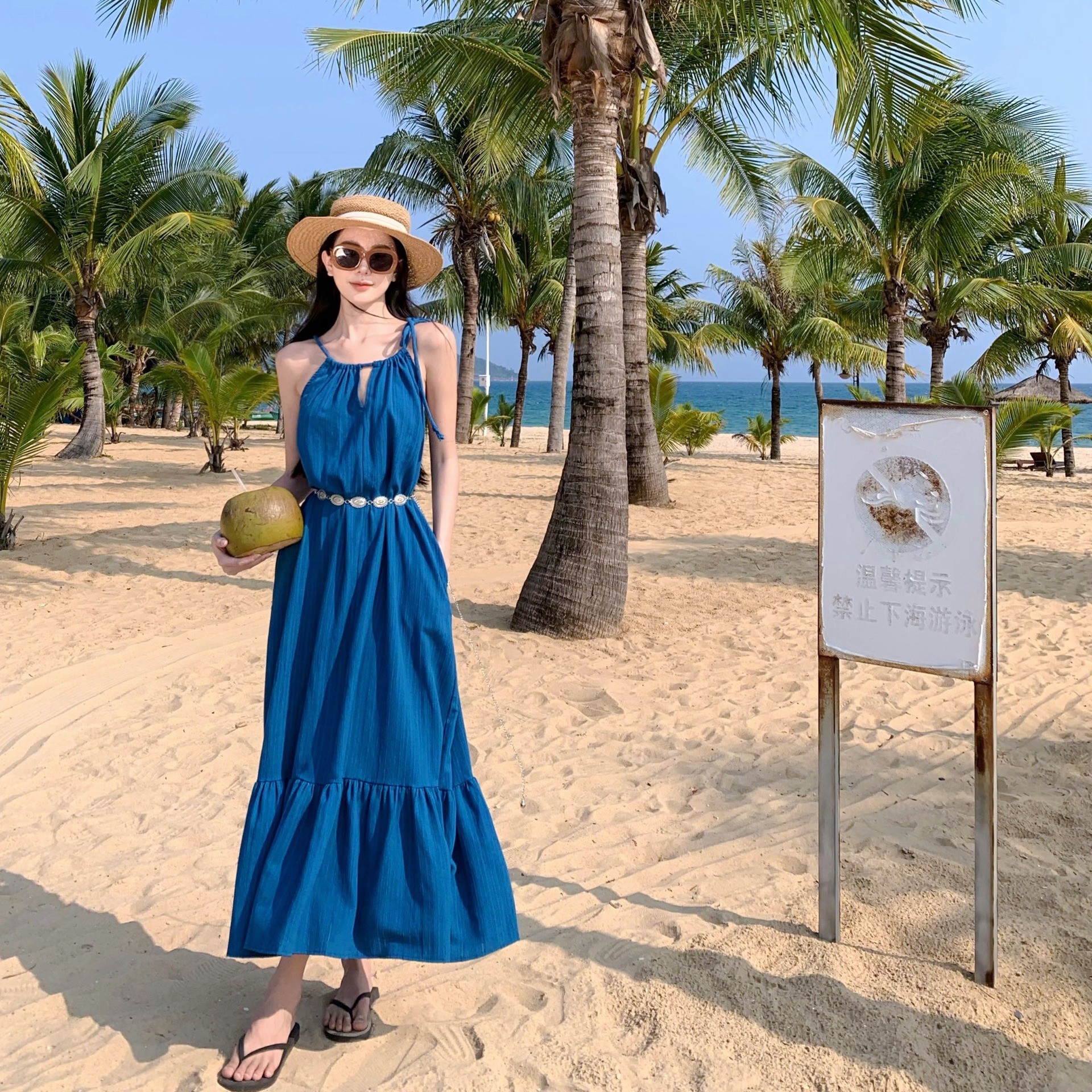 复古优雅法式显白挂脖连衣裙 度假风时尚设计感长裙女