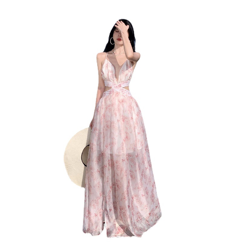 夏季海边度假沙滩裙气质仙仙裙吊带露背V领印花收腰连衣裙女