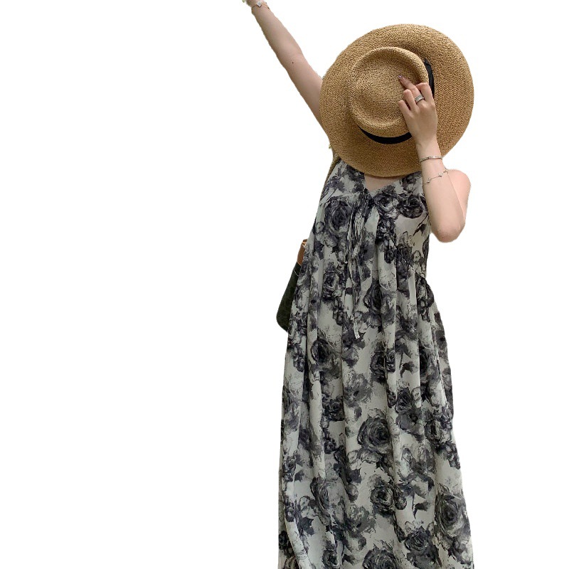 夏季吊带连衣裙女度假风收腰显瘦水墨印花长款v领雪纺裙子