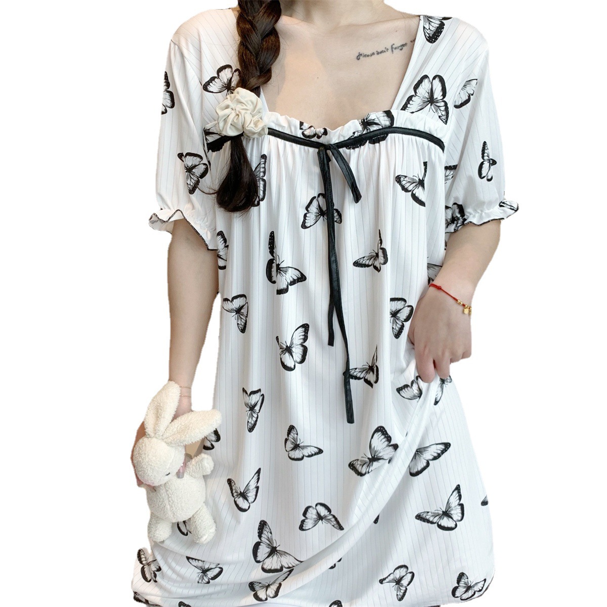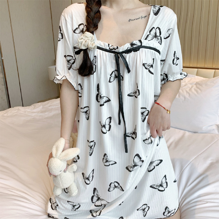 新品夏季新款牛奶丝坑条短袖加肥休闲宽松睡裙家居服裙