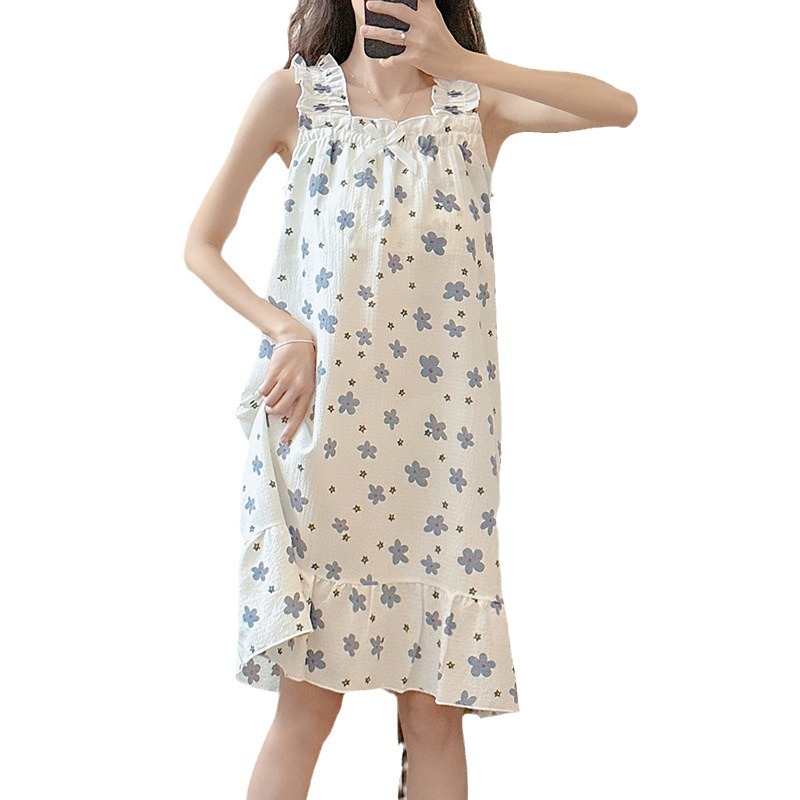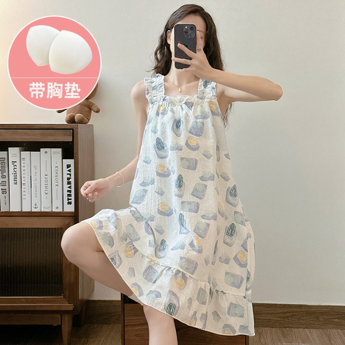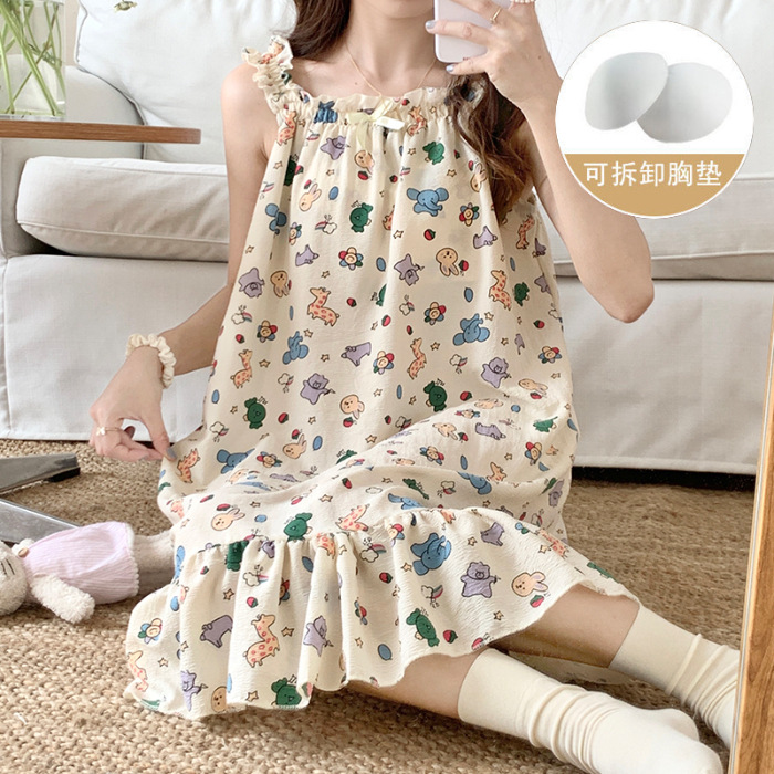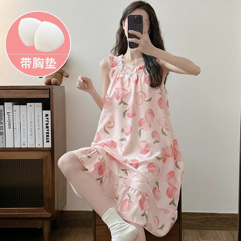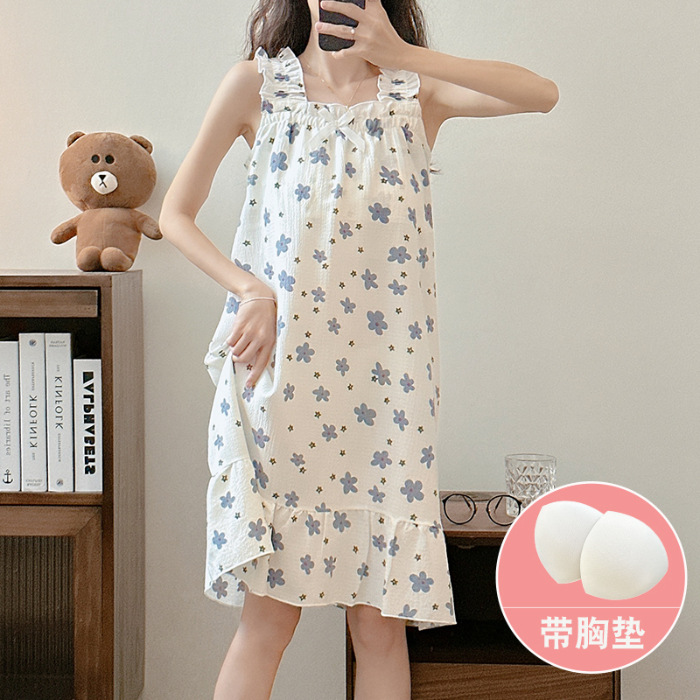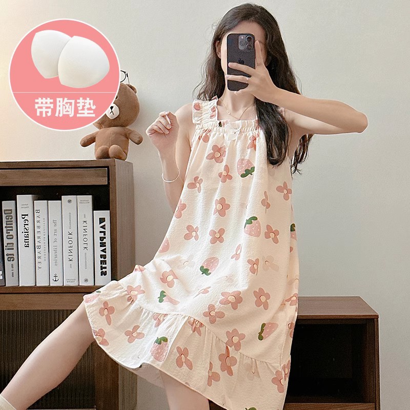可拆卸带胸垫睡裙夏季女性感吊带薄款甜美连体泡泡棉可外穿家居服