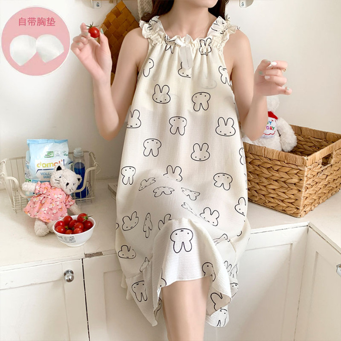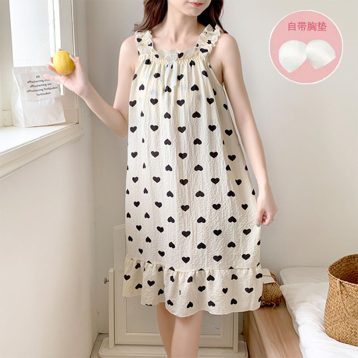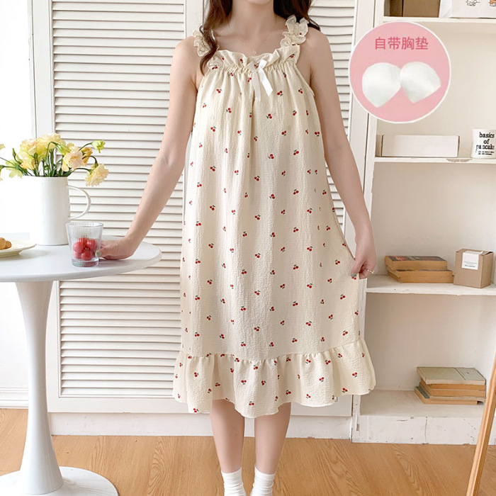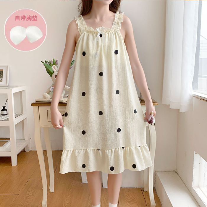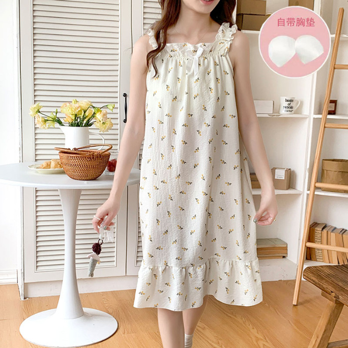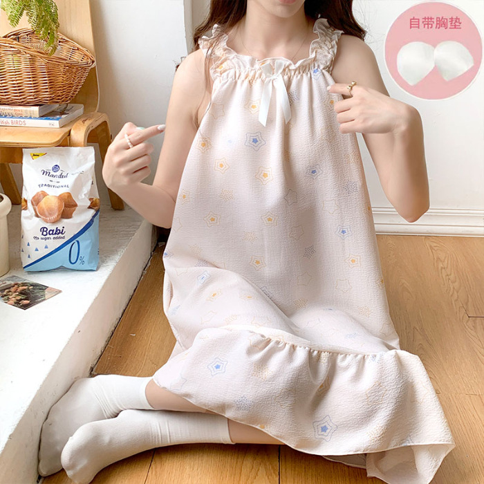 韩版新款吊带中长款睡裙女休闲舒适泡泡皱布带胸垫家居服