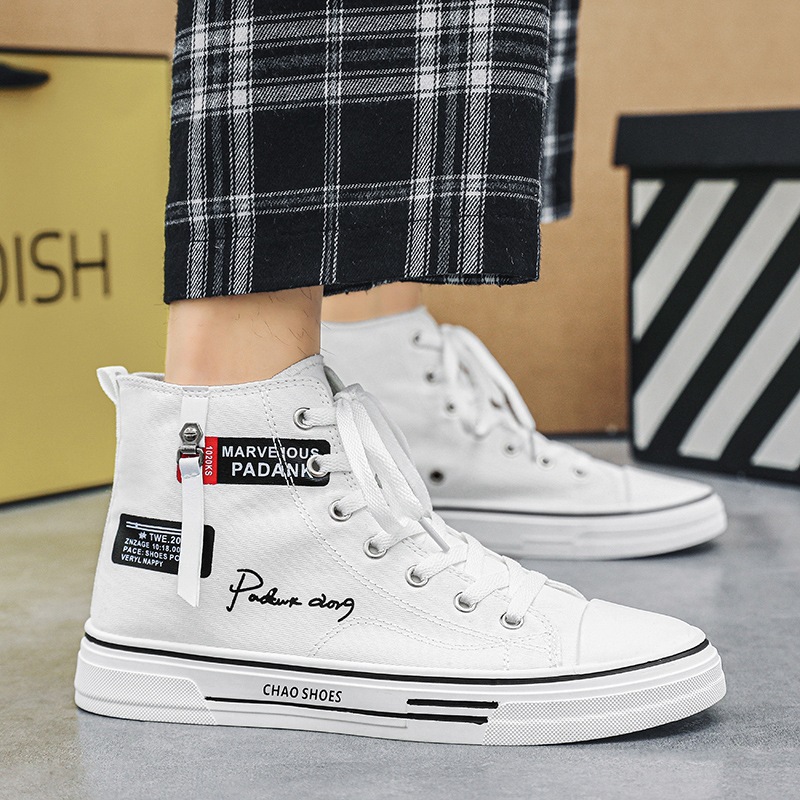 男鞋夏季高帮白色帆布鞋男款年中学生休闲平底滑板鞋子青少年