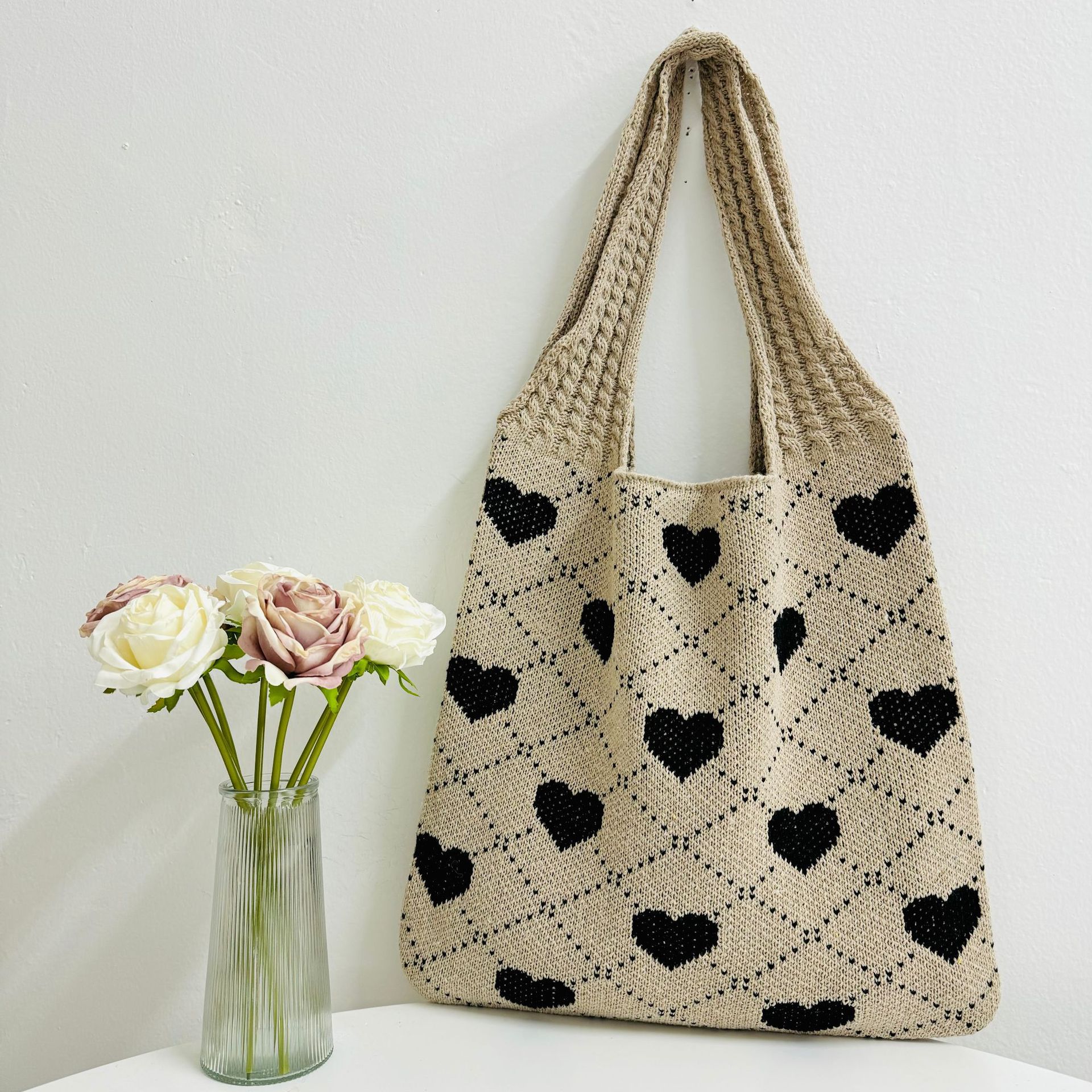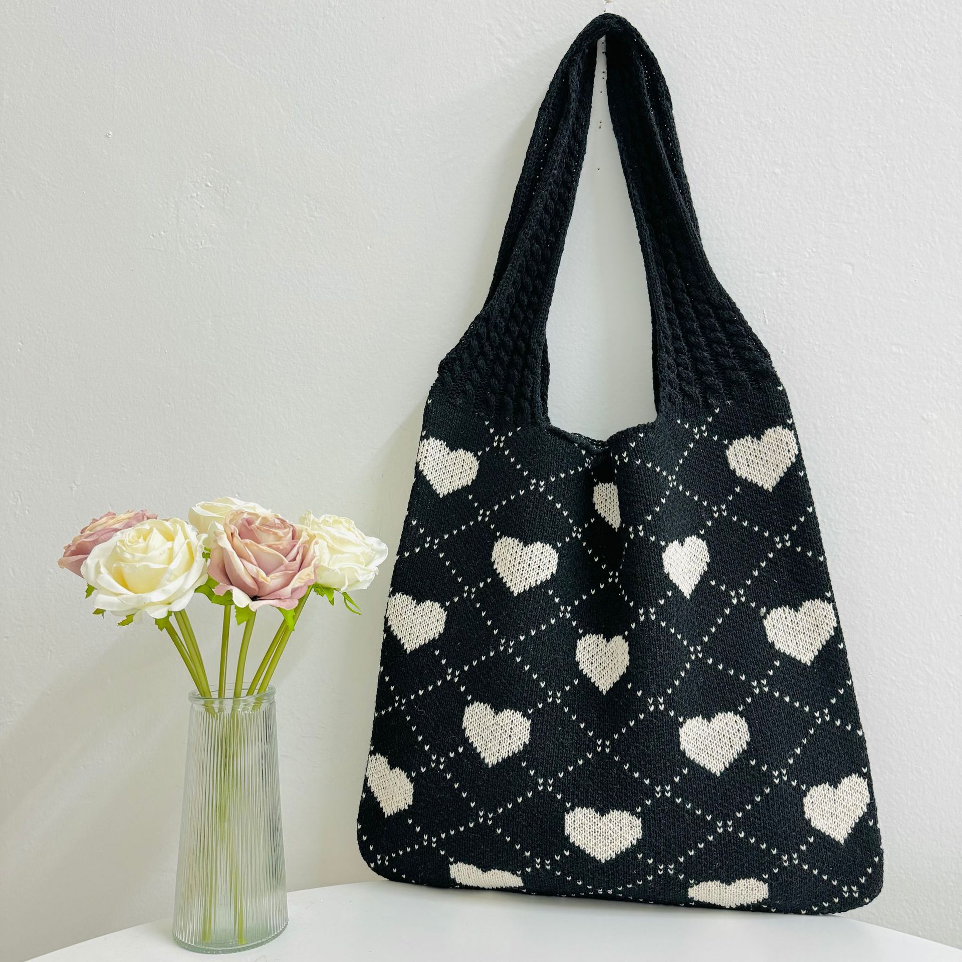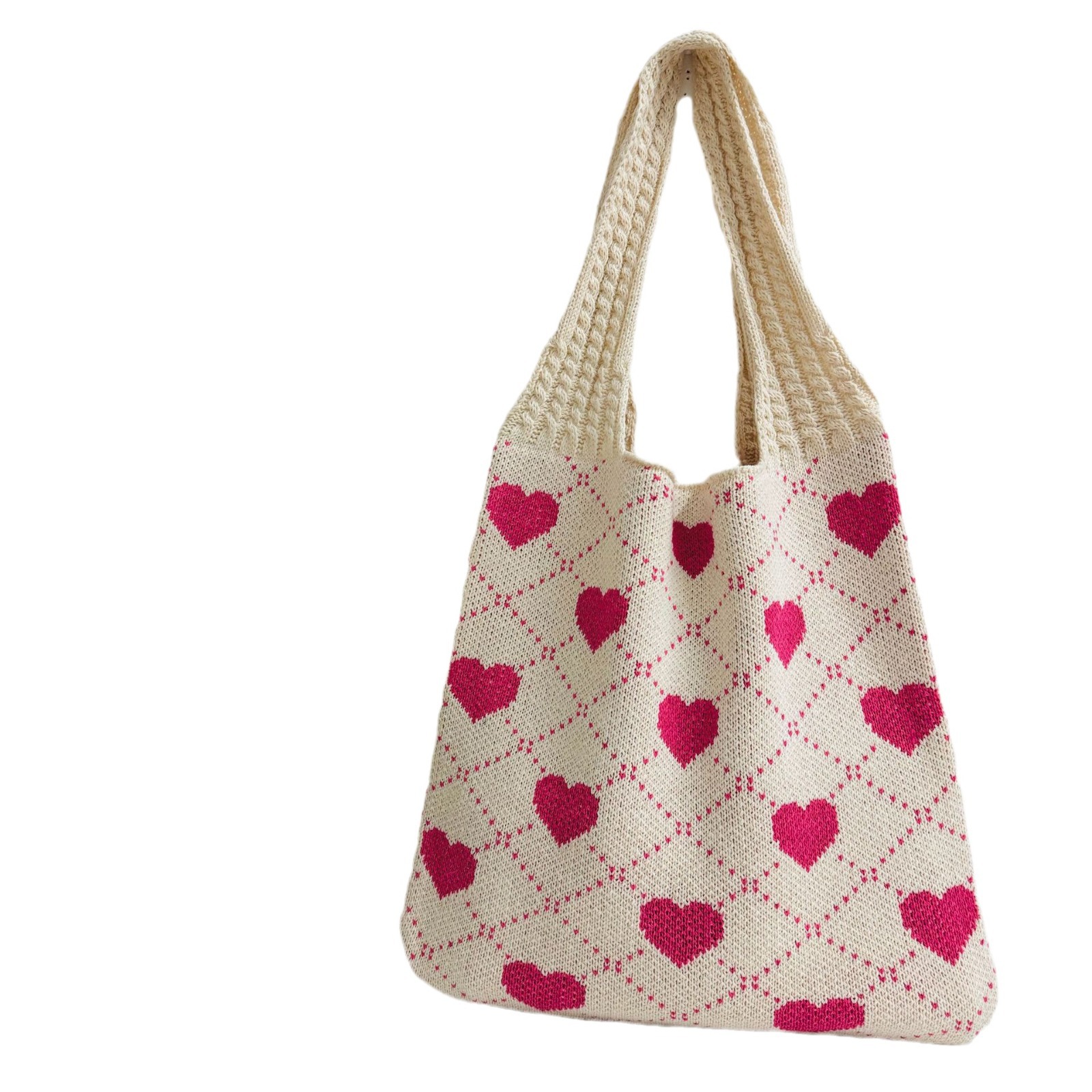 新款日韩托特包购物袋针织包包跨境爱心图案编织包女包
