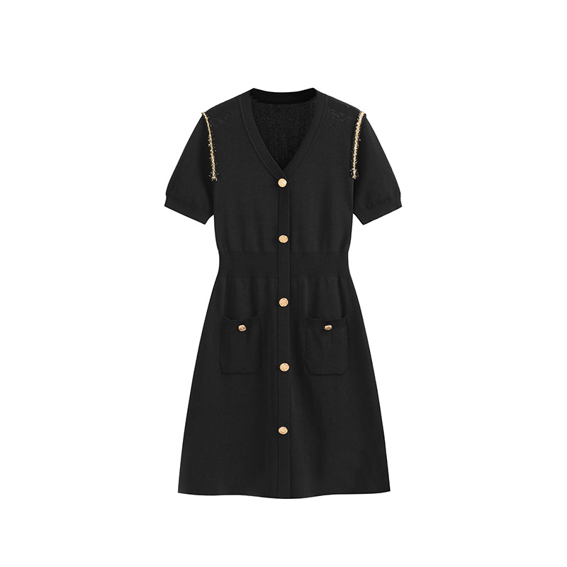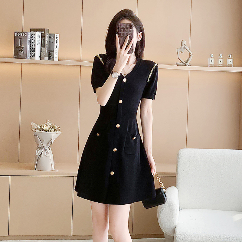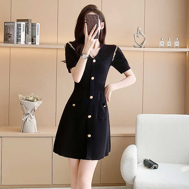 小香风小黑裙女夏季赫本风十三行女装短袖A字冰丝针织连衣裙