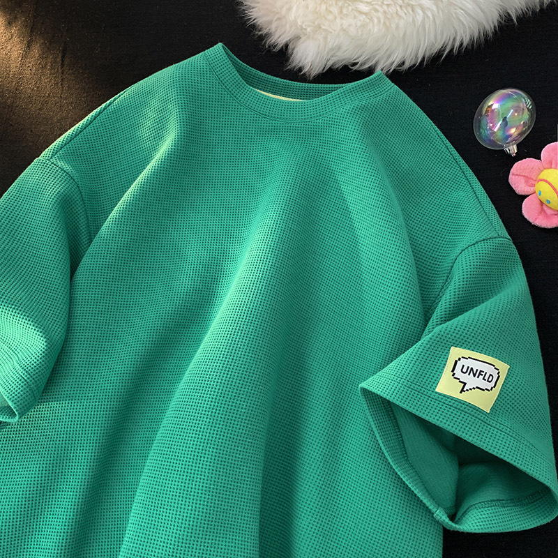 商场专柜清仓短袖t恤男生华夫格宽松五分袖重磅青少年半袖上衣服
