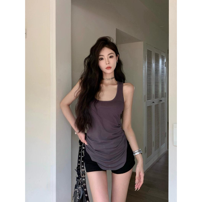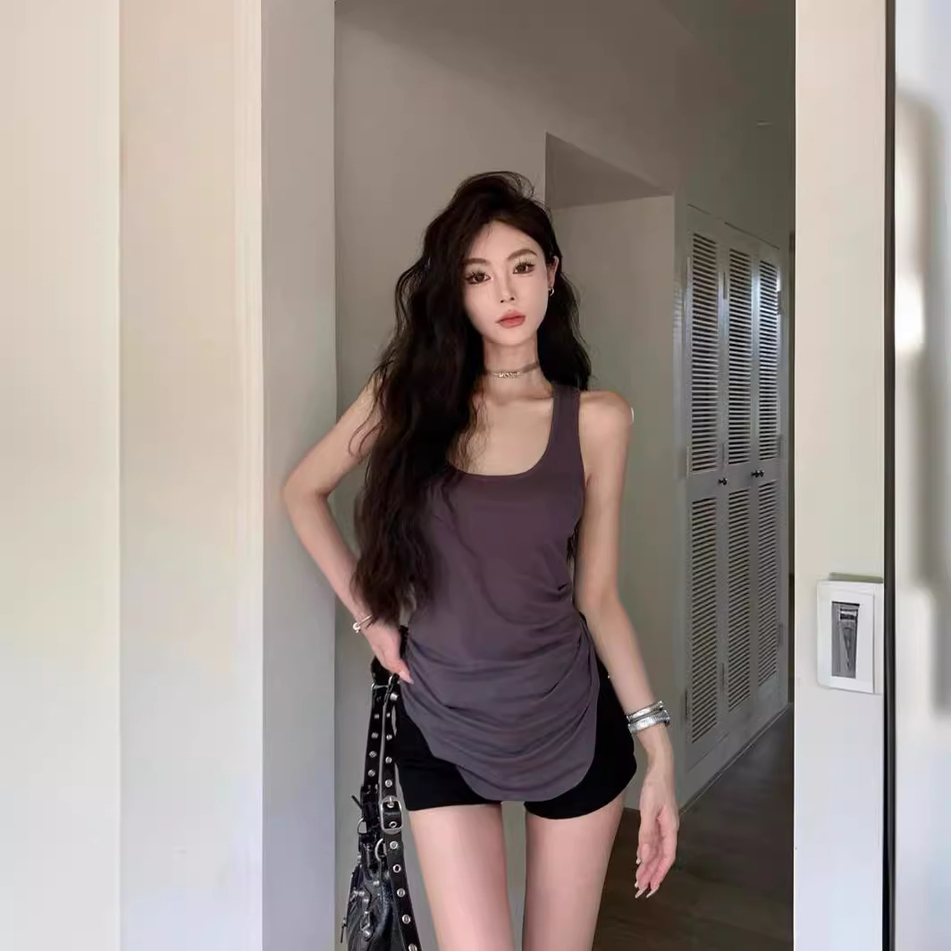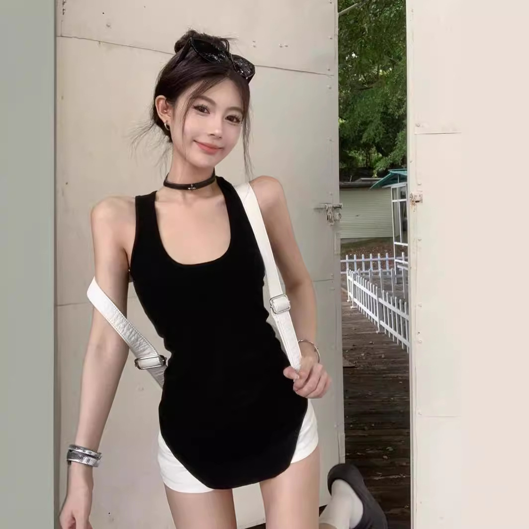 美式白色中长款工字背心吊带女夏季u型下摆修身无袖辣妹上衣外穿