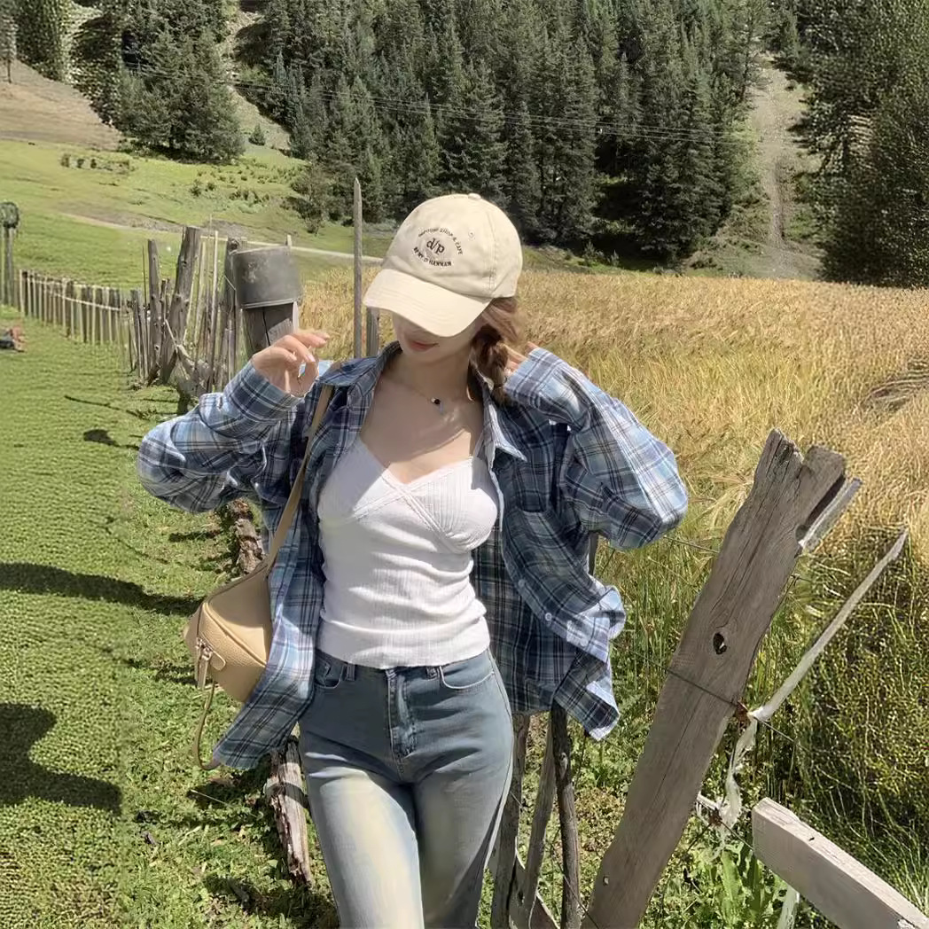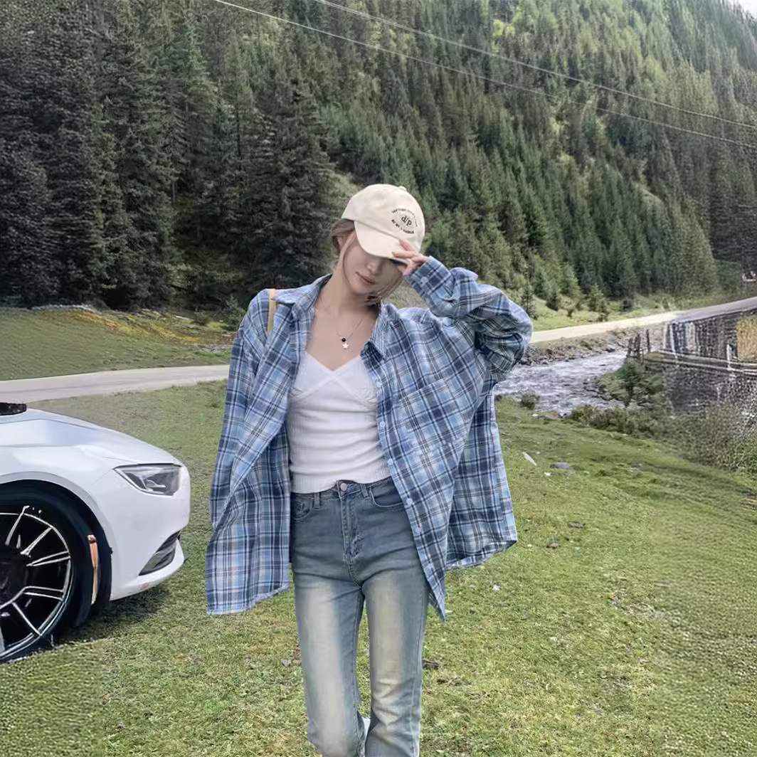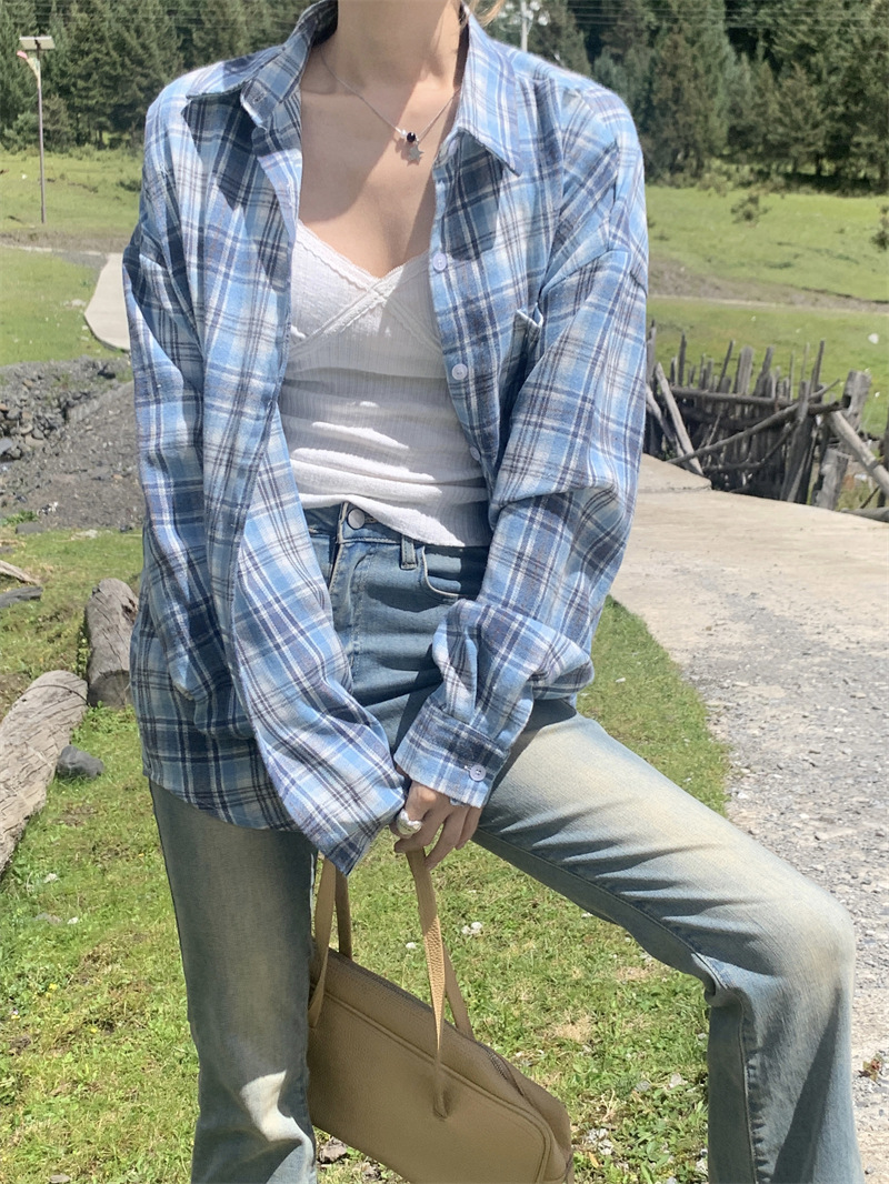 蓝色格子POLO领长袖休闲衬衫女春季宽松显瘦衬衣百搭chin开衫上衣
