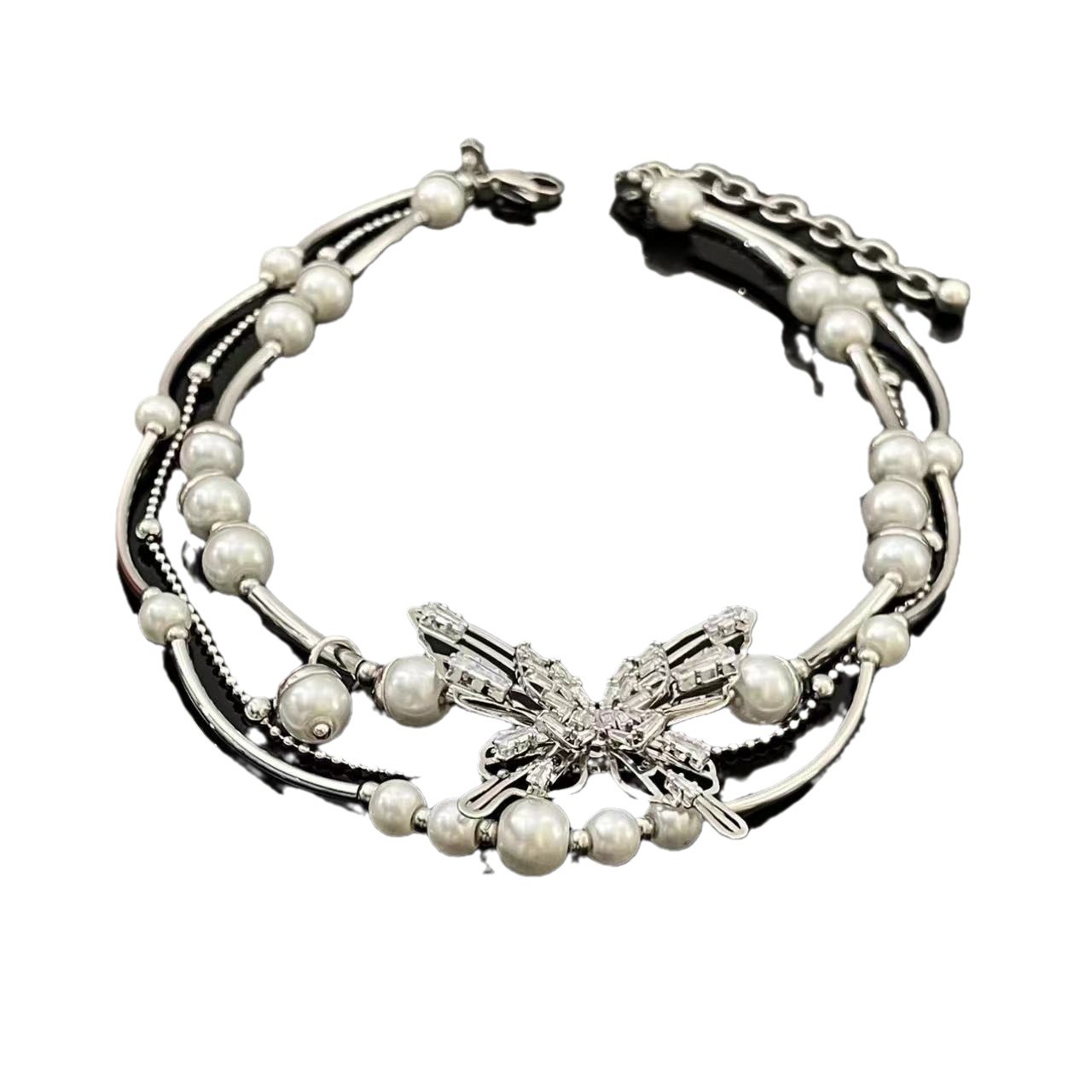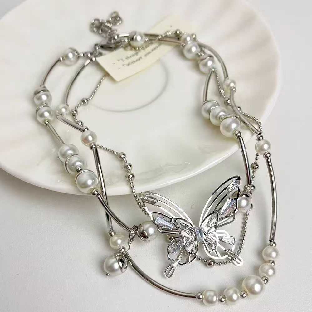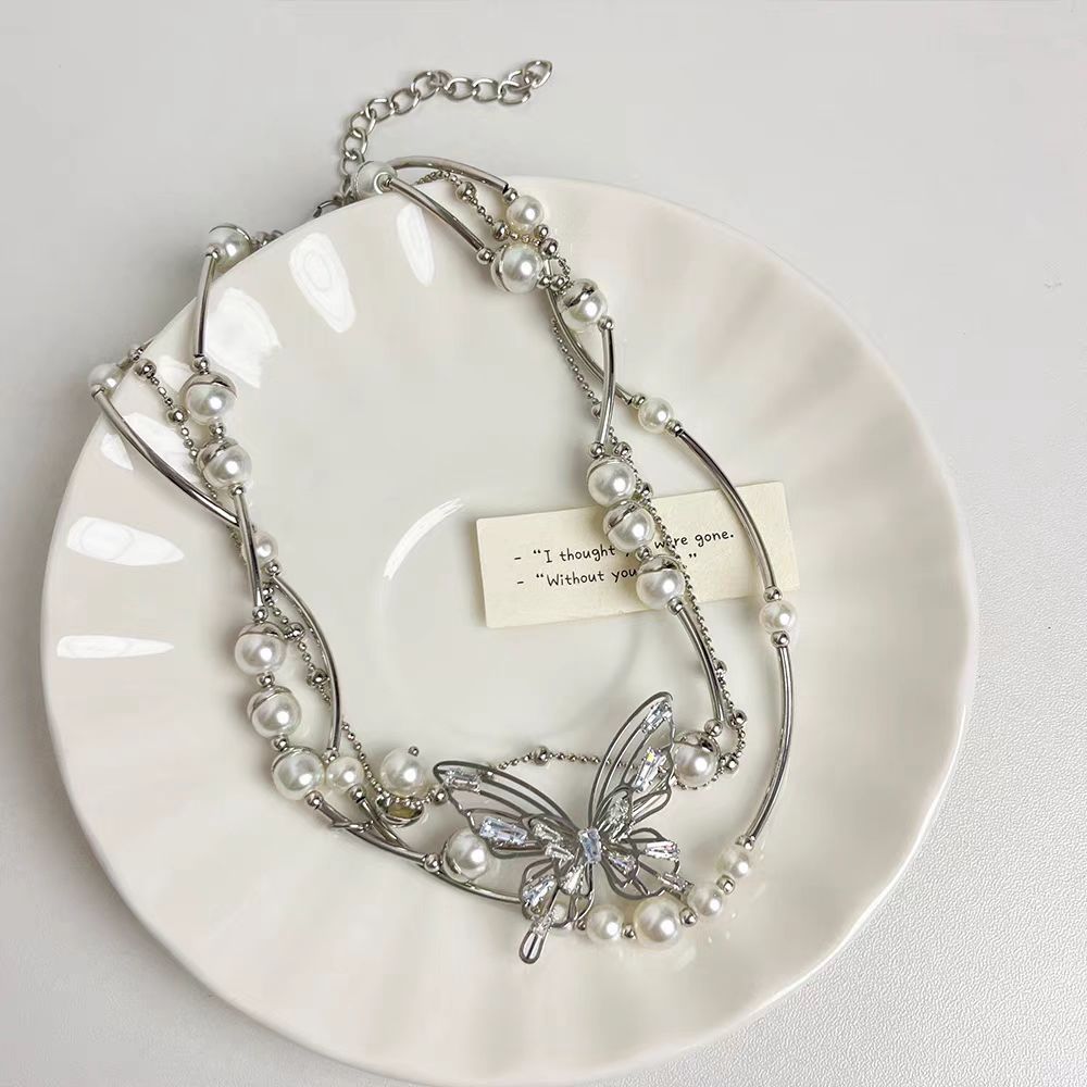 辣妹锆石镂空蝴蝶叠戴珍珠项链女choker轻奢小众高级感锁骨链潮
