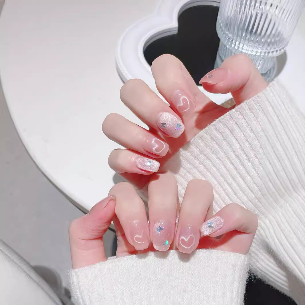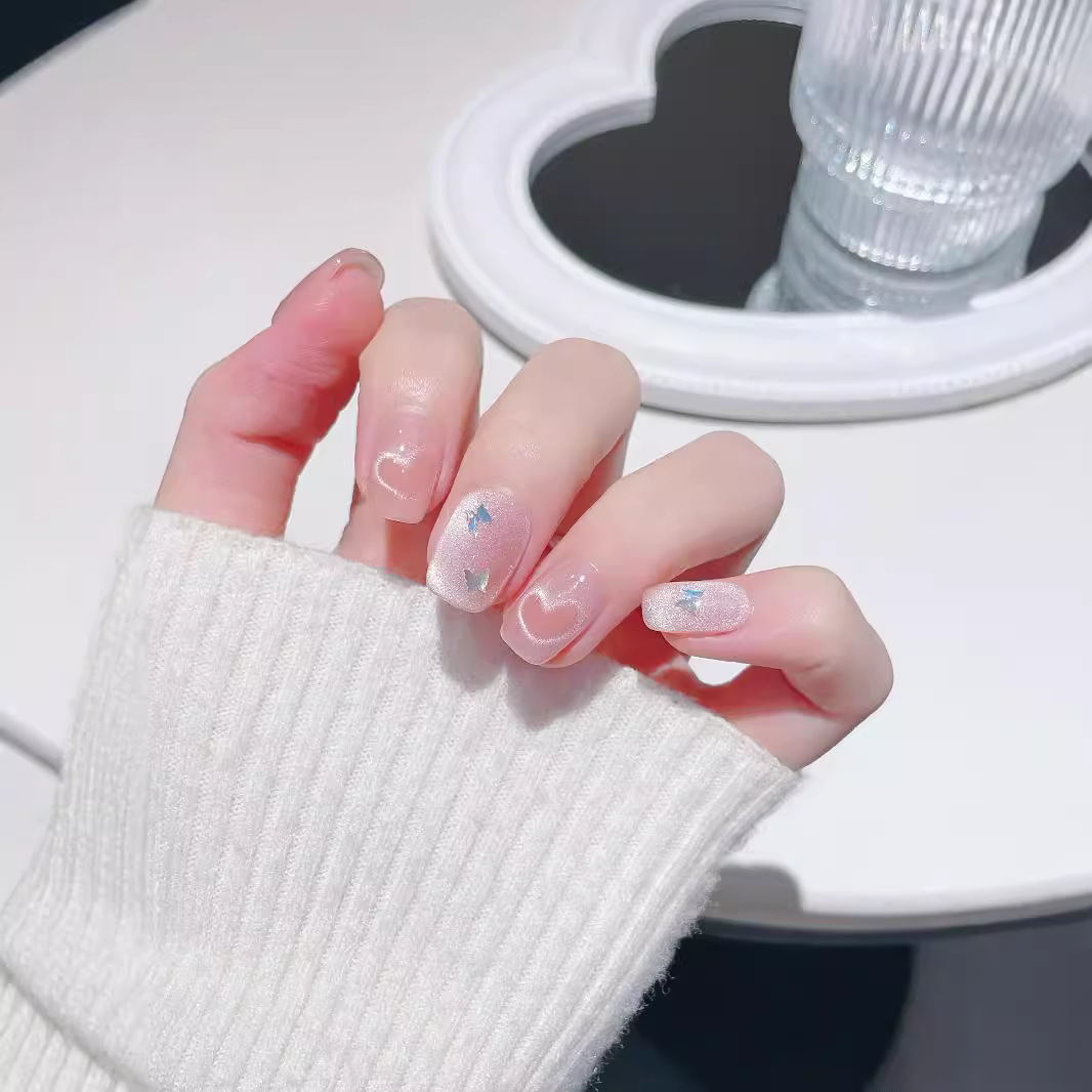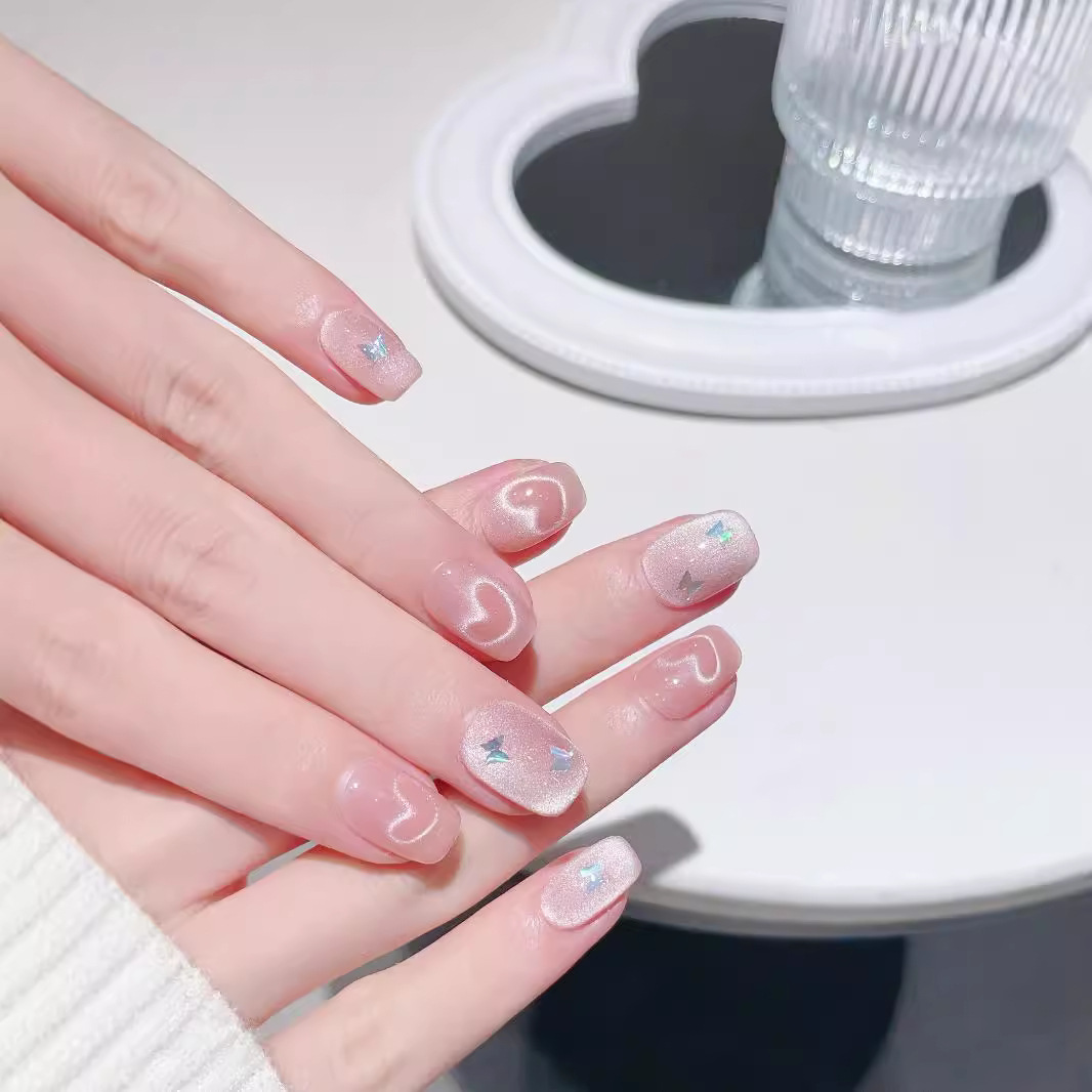 怦然心动纯手工穿戴甲蝴蝶裸色清透猫眼显白光疗美甲贴片