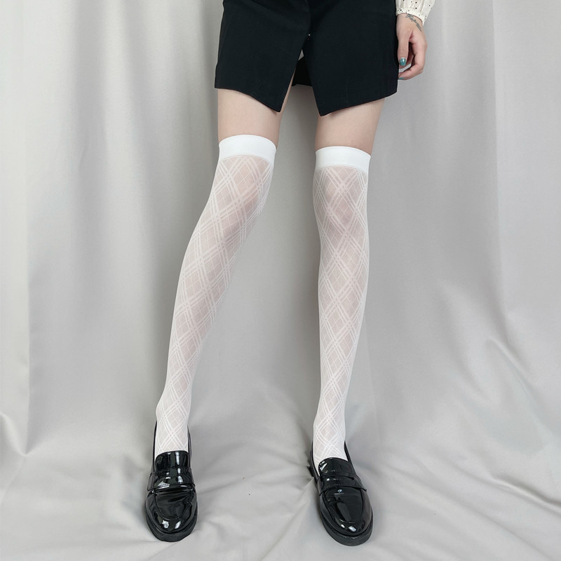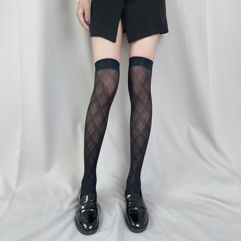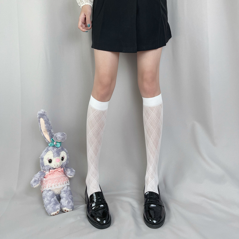 日系黑色暗纹网格小腿袜菱形格丝袜jk中筒袜春秋长筒ins潮大腿袜