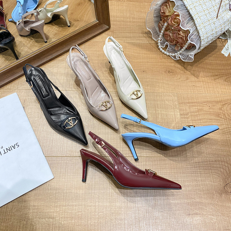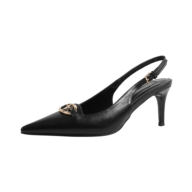 春夏新品气质尖头金属百搭金属搭扣休闲后空细跟休闲真皮凉鞋女