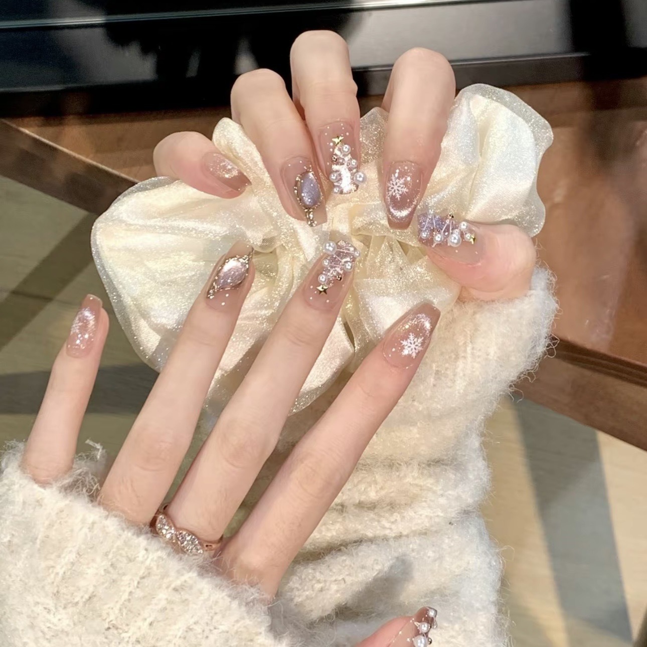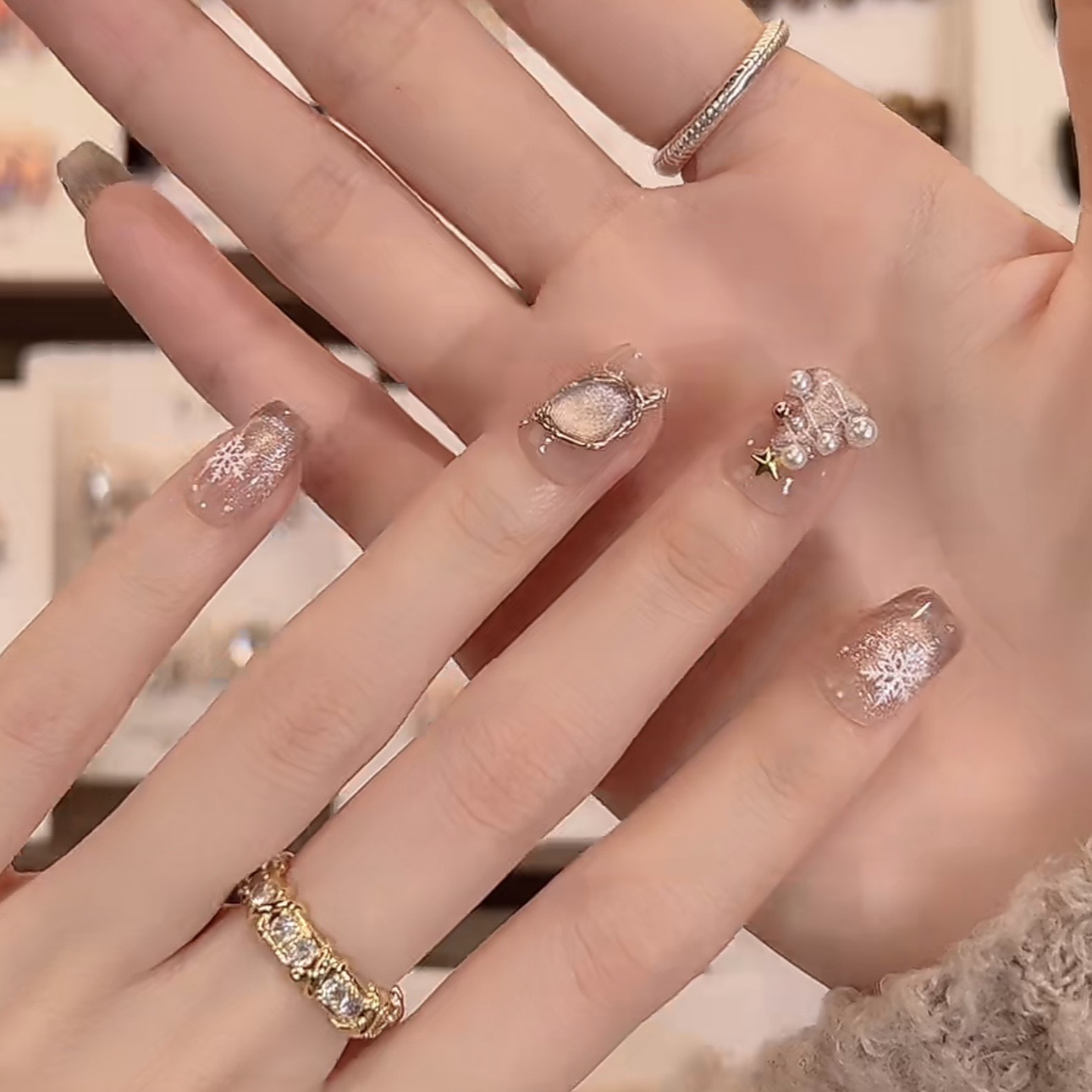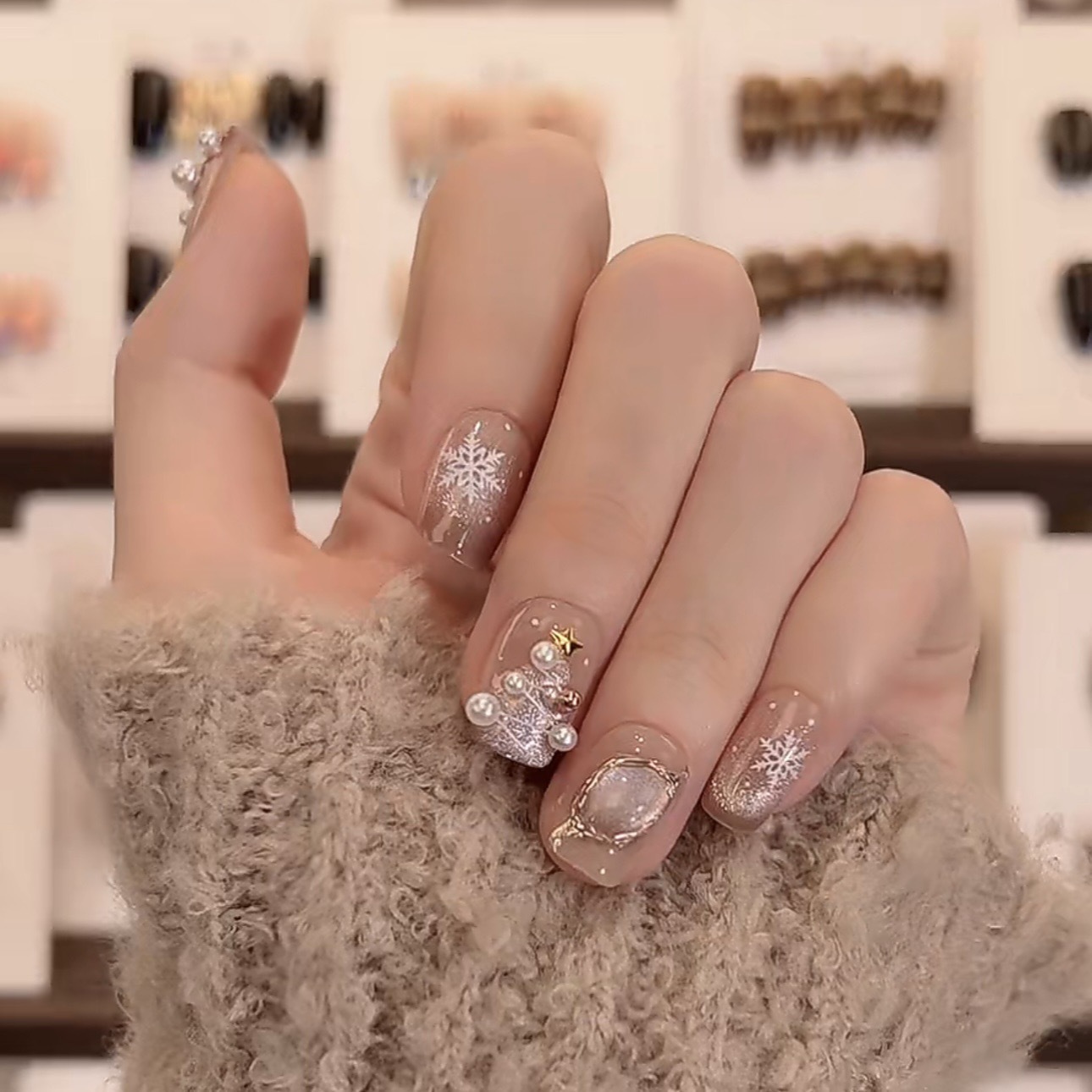 纯手工光疗圣诞猫眼巴洛克风格圣诞雪花穿戴甲圣诞树成品