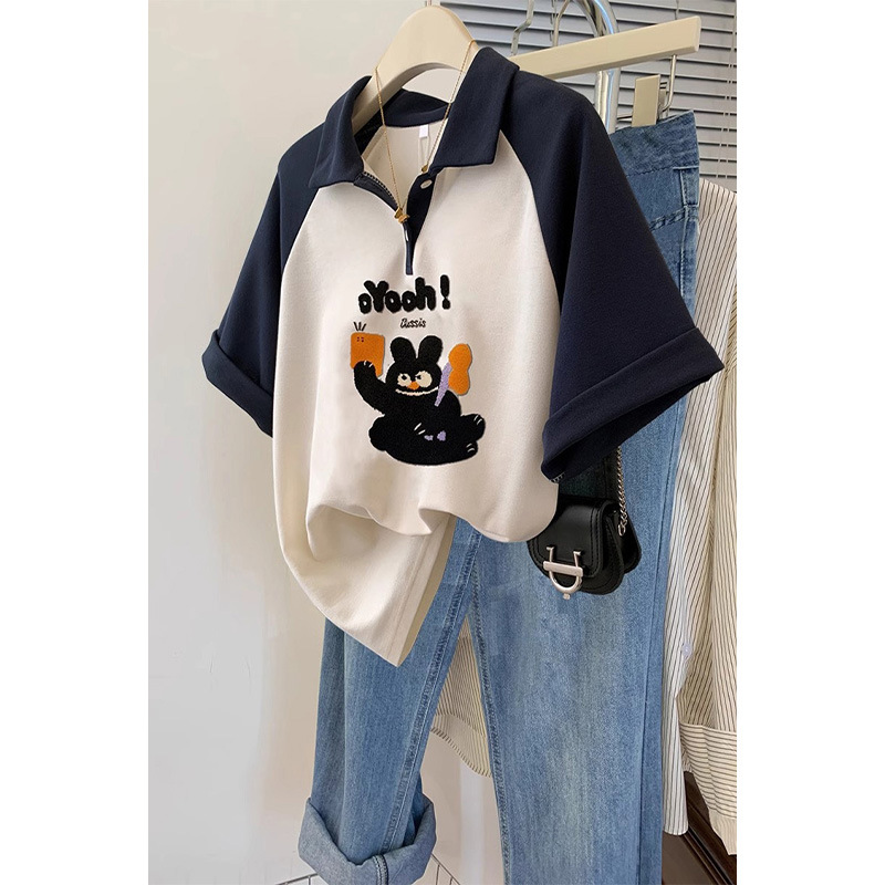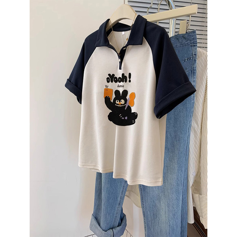 polo衫插肩短袖T恤女夏季宽松设计感撞色半袖oversize中长款上衣