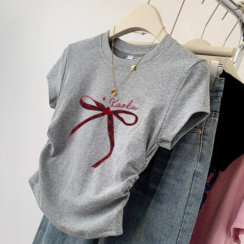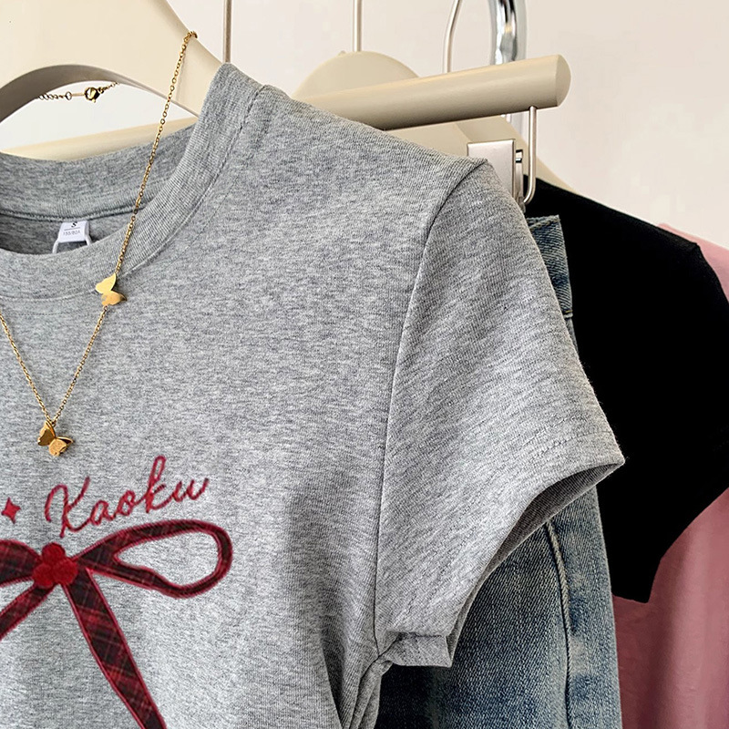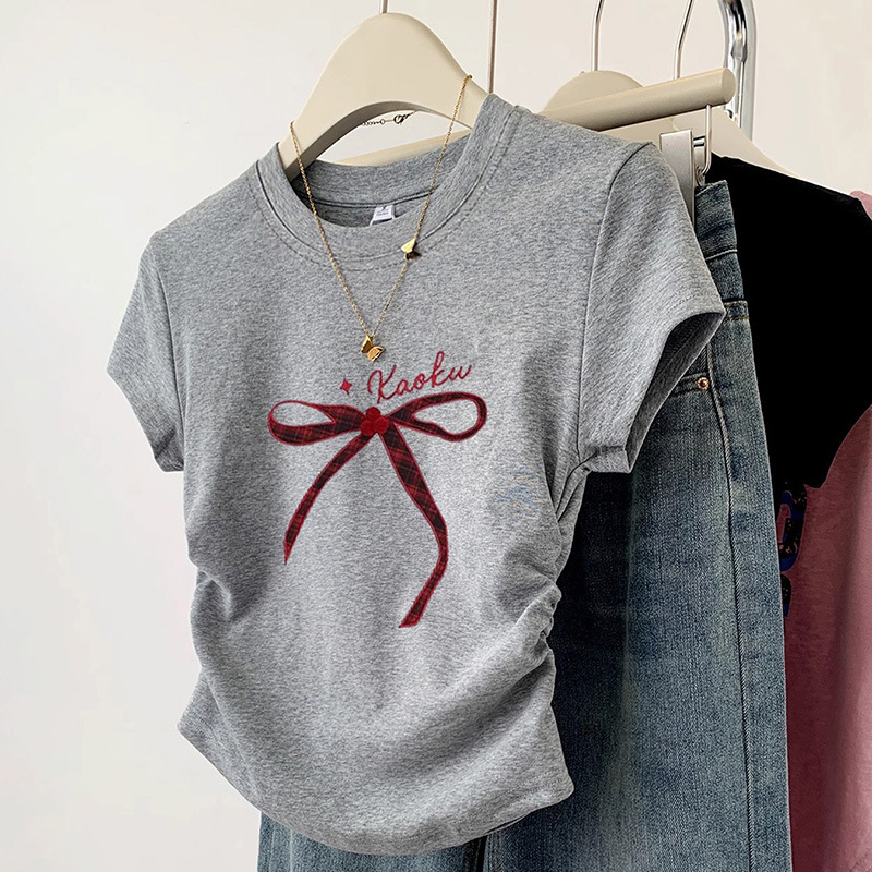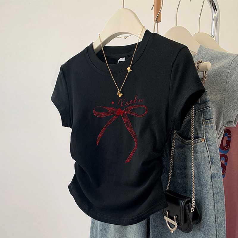 纯棉蝴蝶结短款短袖t恤女夏季新款设计感小个子修身正肩上衣