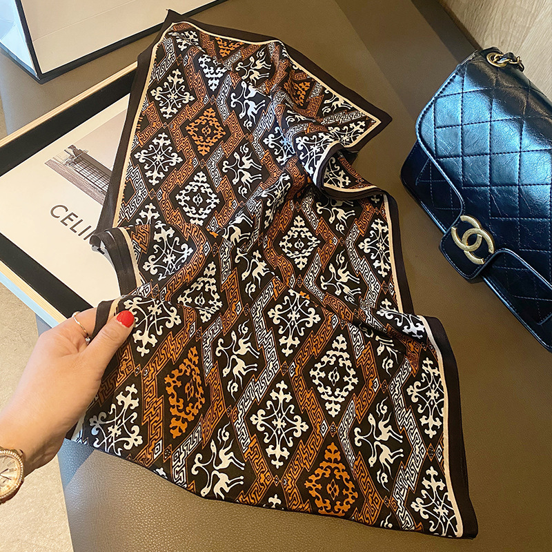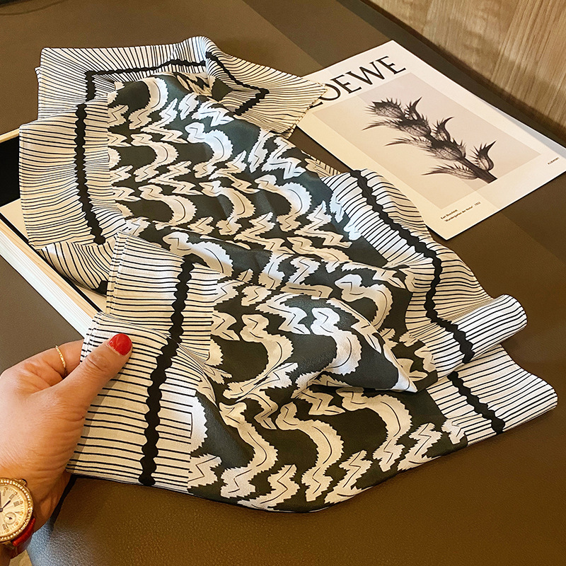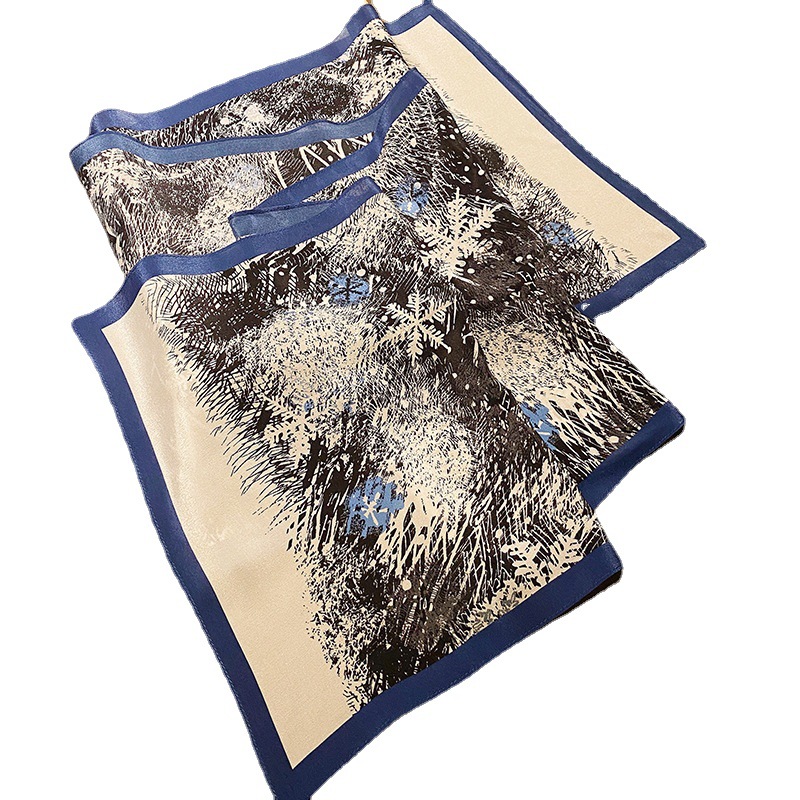 版画风蓝边100%桑蚕丝真丝丝巾女新款洋气时尚装饰围巾平纹卷边