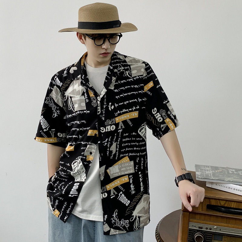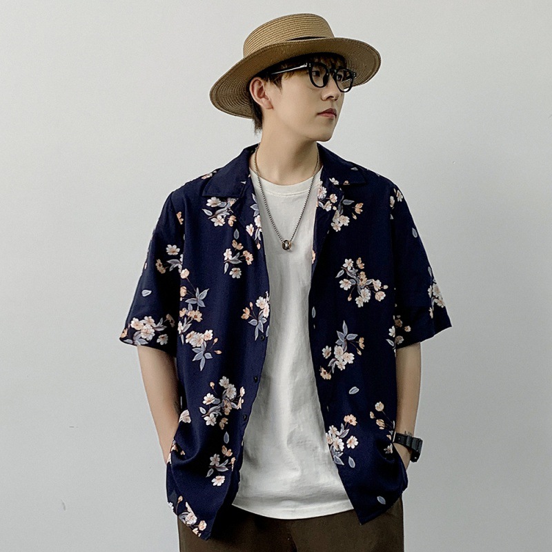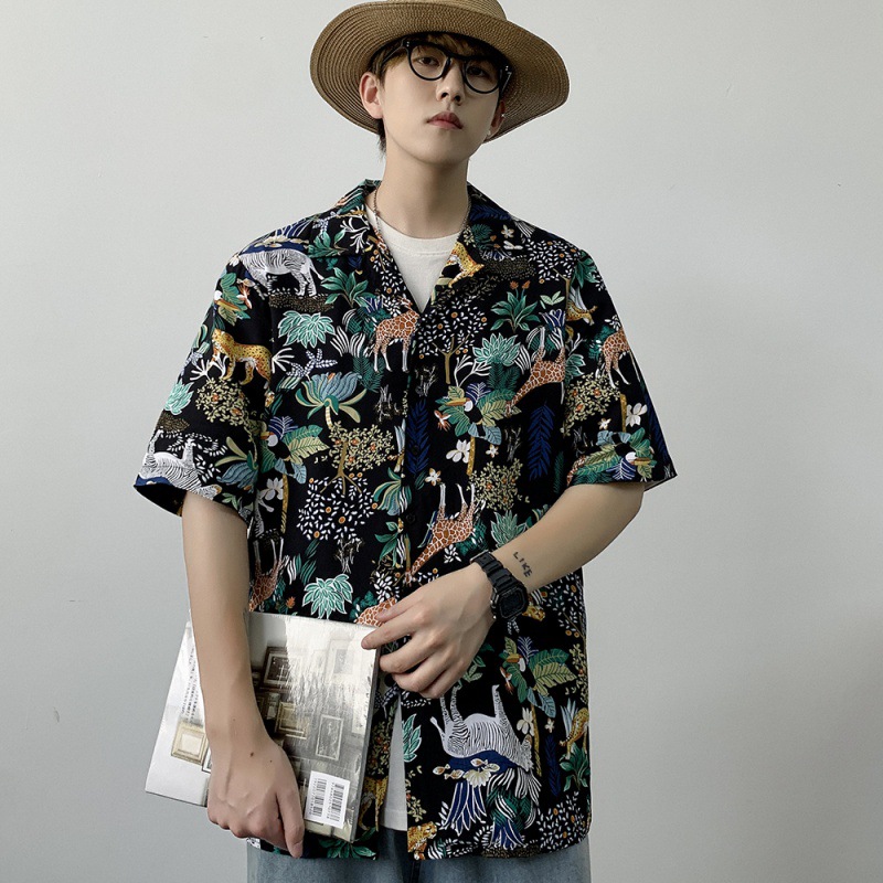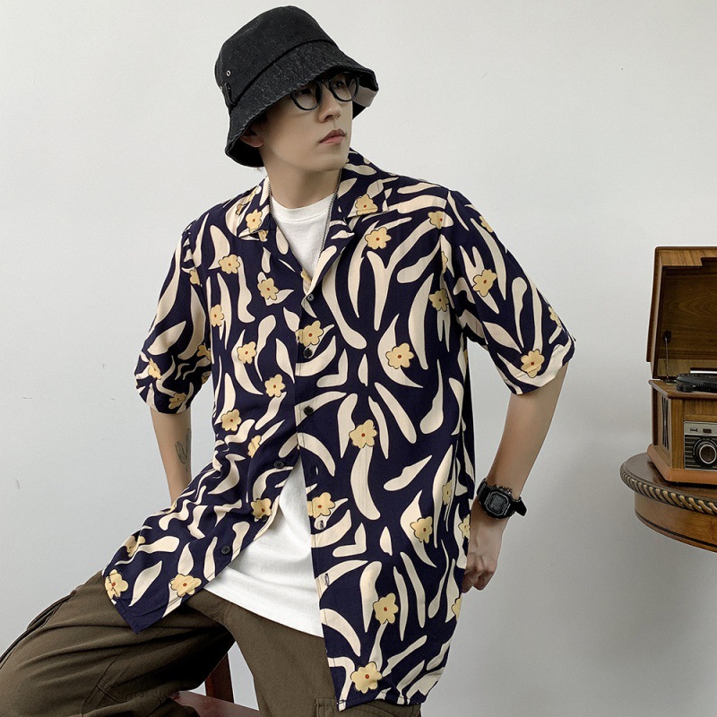 港风短袖花衬衫男夏季薄款宽松百搭休闲情侣海边五分袖衬衣外套潮