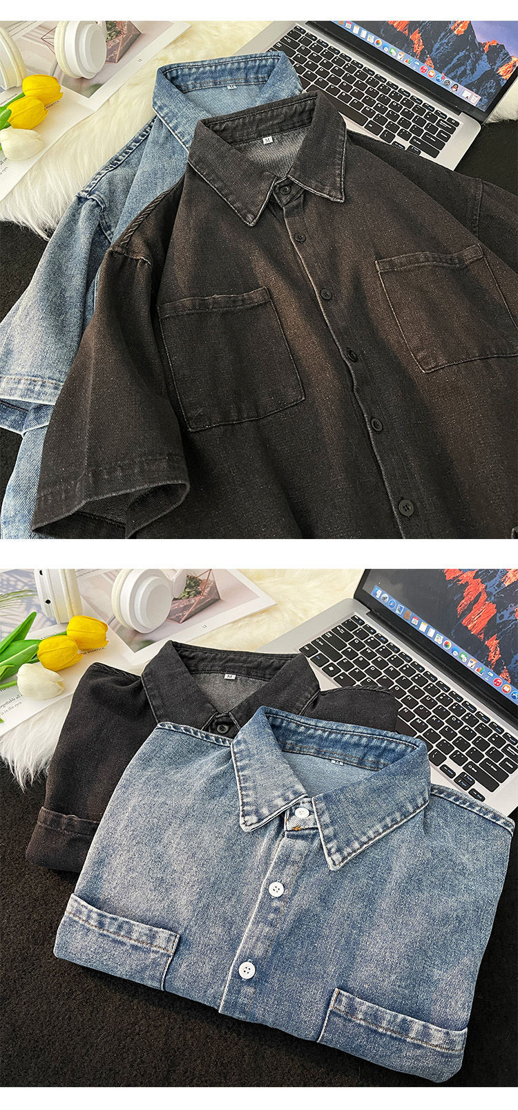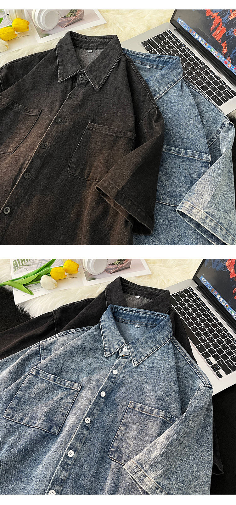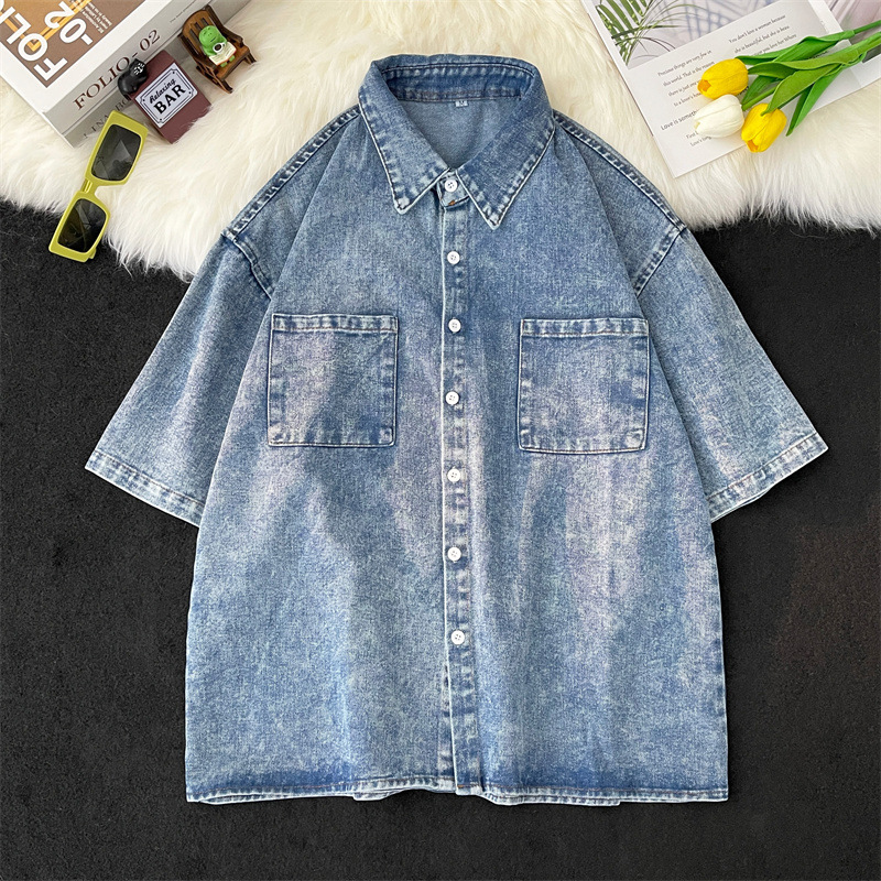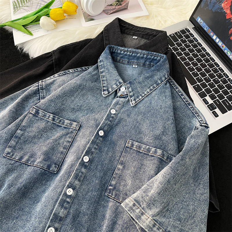 夏季薄款短袖牛仔衬衫男潮牌ins宽松纯色青少年水洗港风复古外套