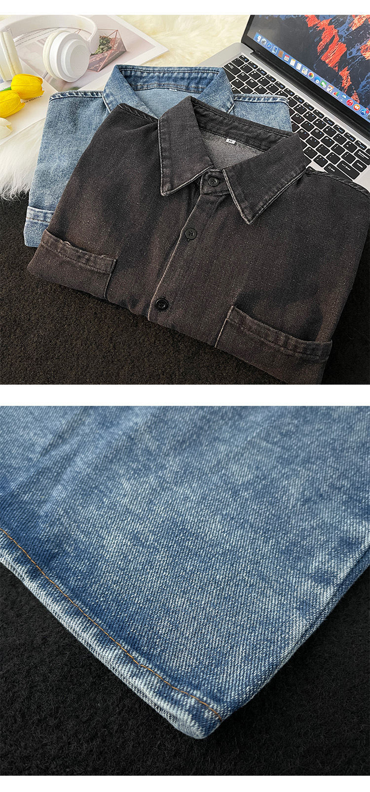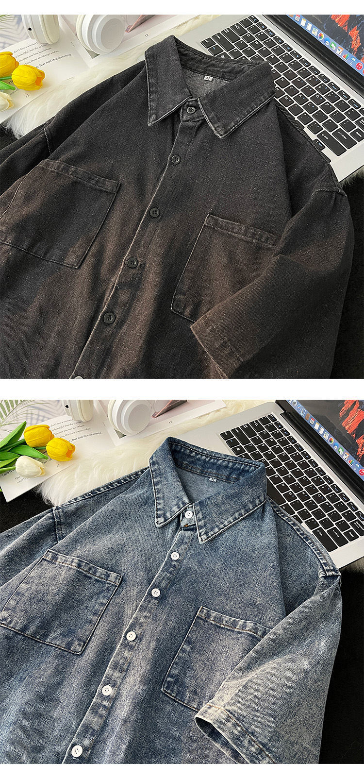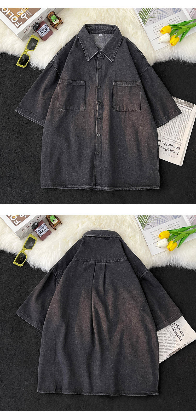 夏季薄款短袖牛仔衬衫男潮牌ins宽松纯色青少年水洗港风复古外套