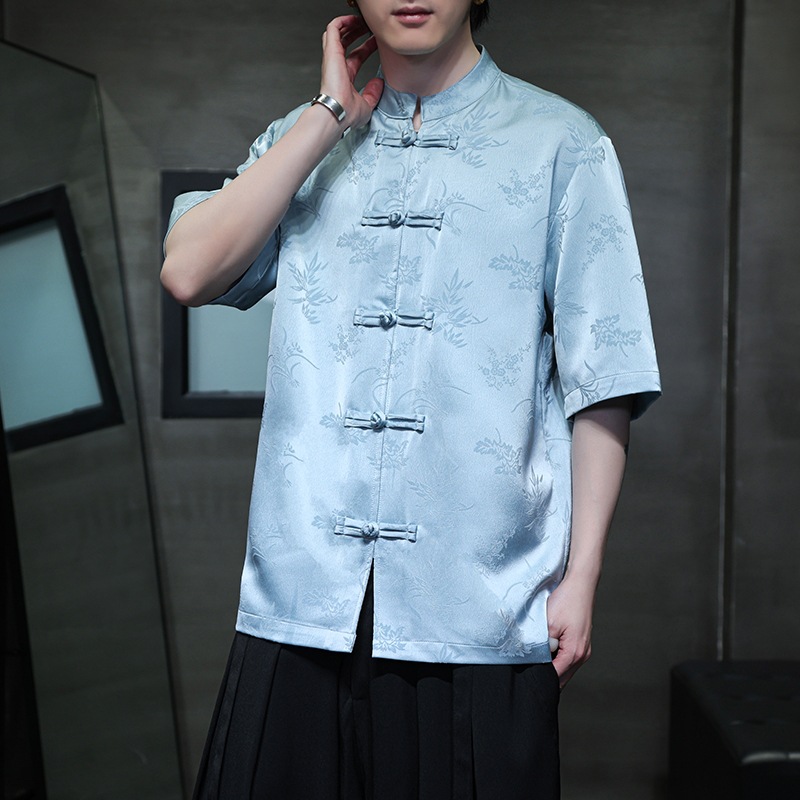 中国风新款夏季男装新中式汉服五分袖衬衫大码潮流短袖T恤男