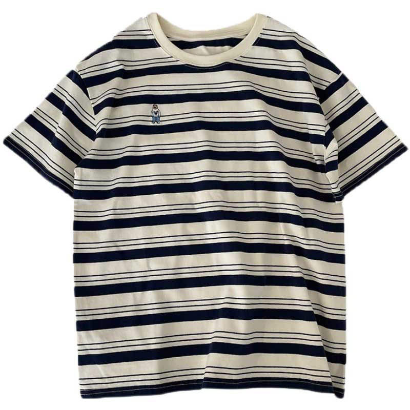 纯棉撞色复古条纹短袖t恤女装夏季新款宽松大码刺绣小衫上衣