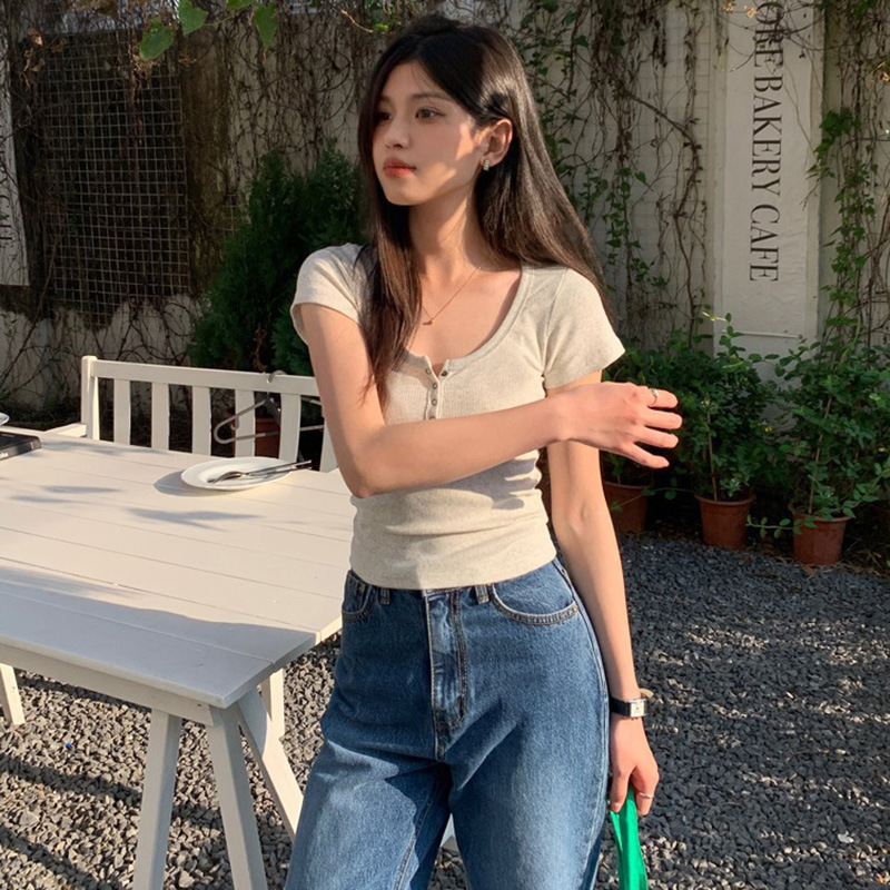 温柔风正肩v领短袖t恤女夏新款紧身显瘦设计感短款打底上衣潮