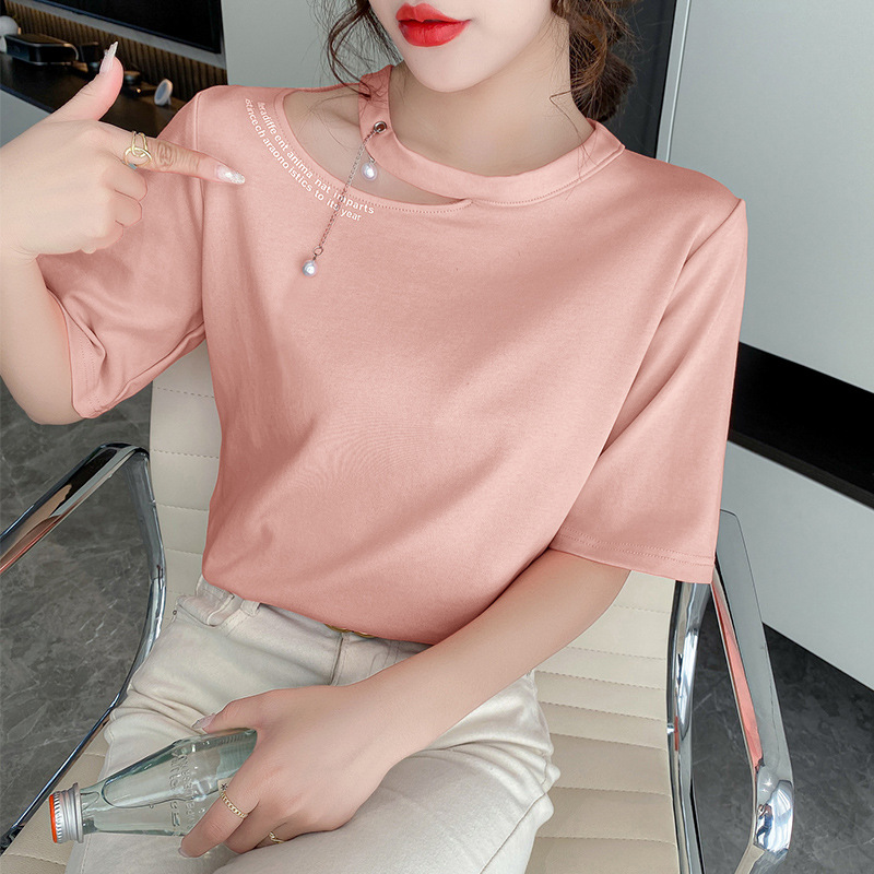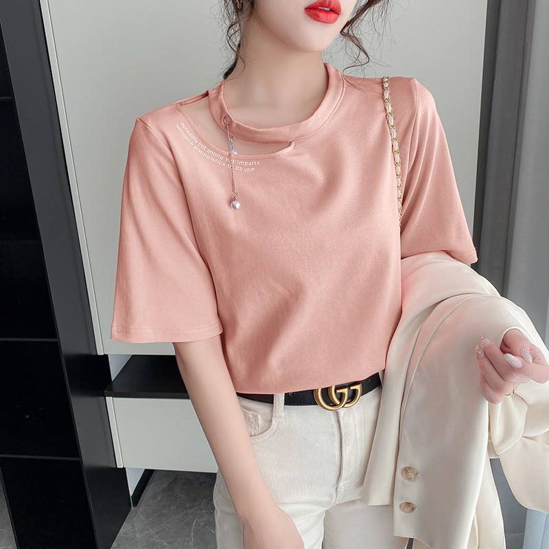 粉色T恤女短袖夏季宽松韩版露锁骨设计感小众半袖纯棉体桖上衣ins
