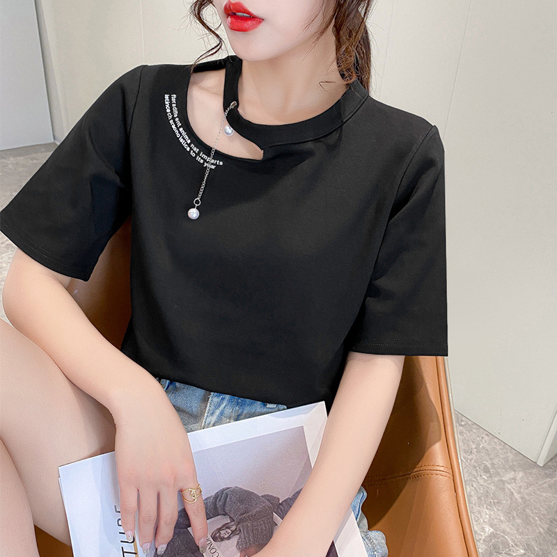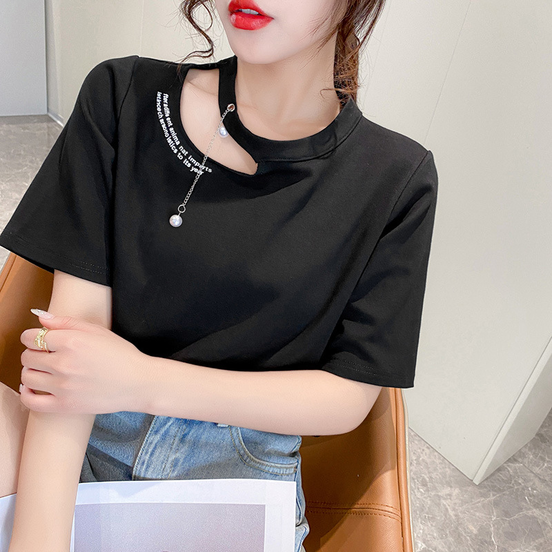 正肩圆领短袖新款韩版小众百搭纯欲风印花字母t恤女短款上衣