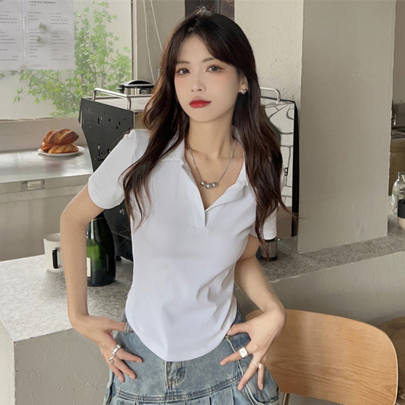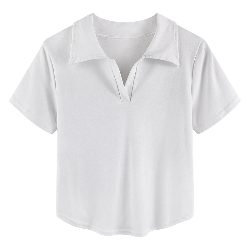polo领白色短袖t恤女夏季v领设计感小众修身短款小个子辣妹上衣潮