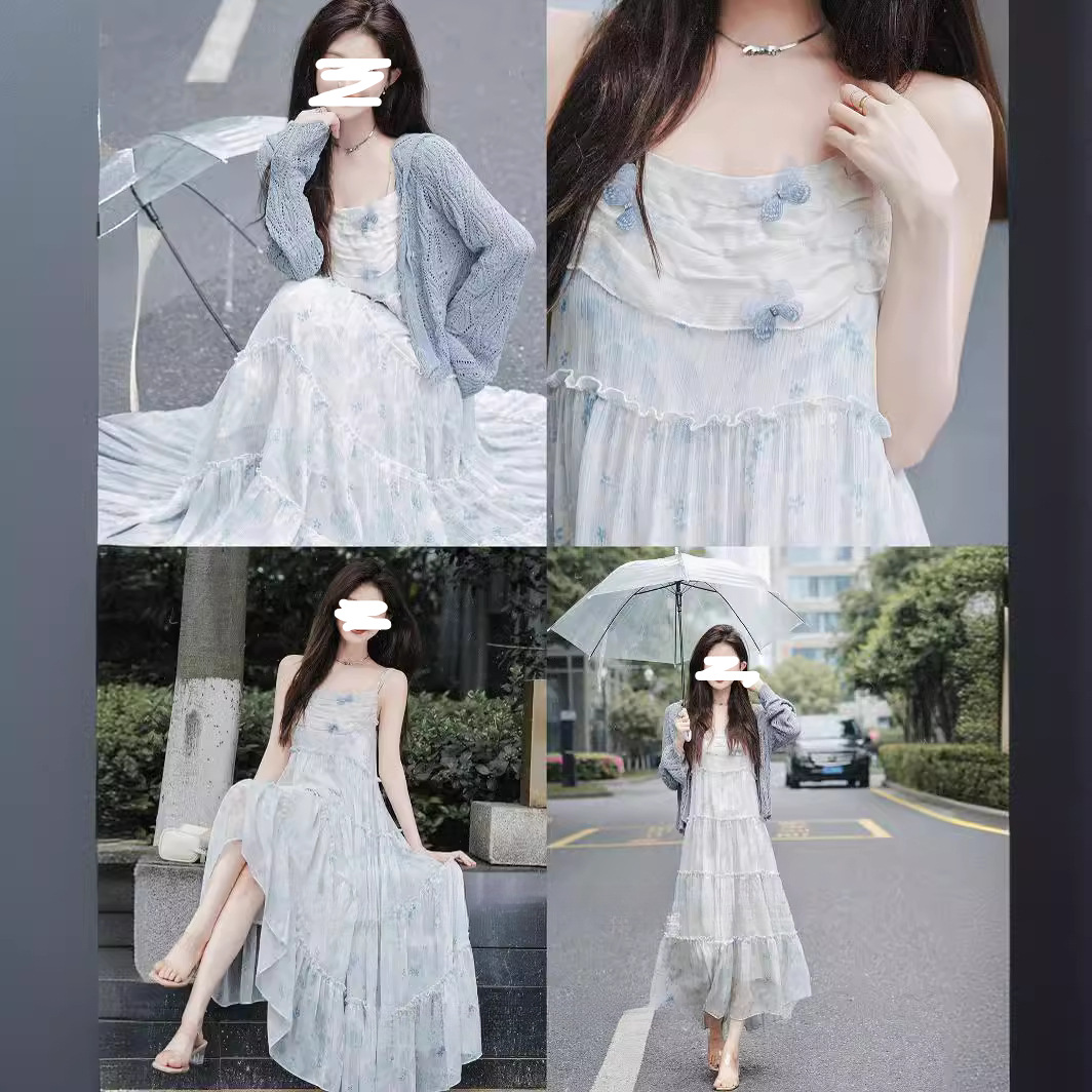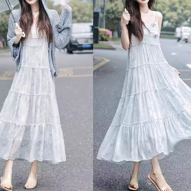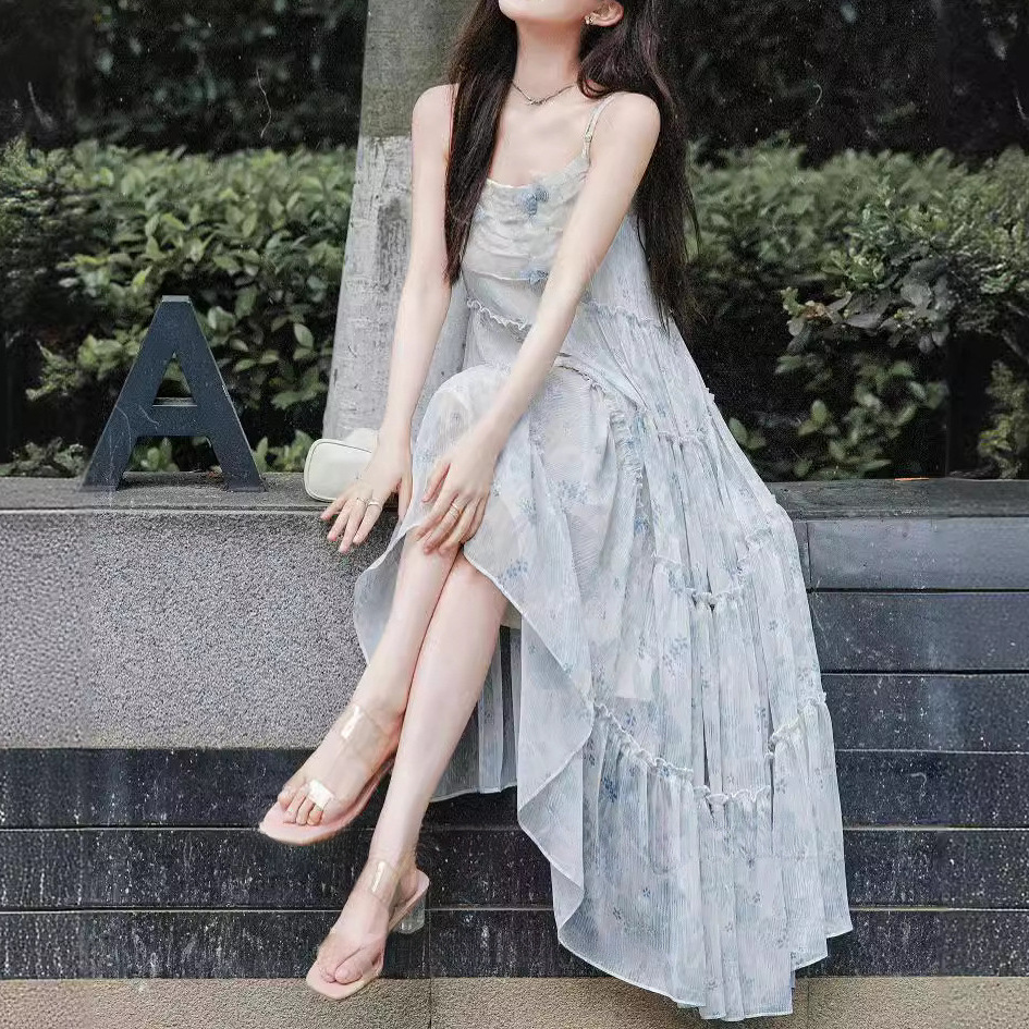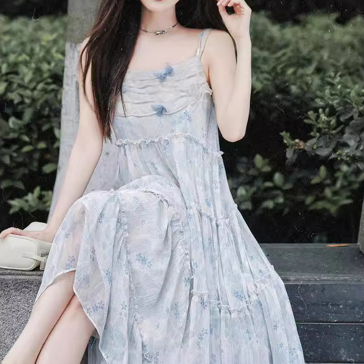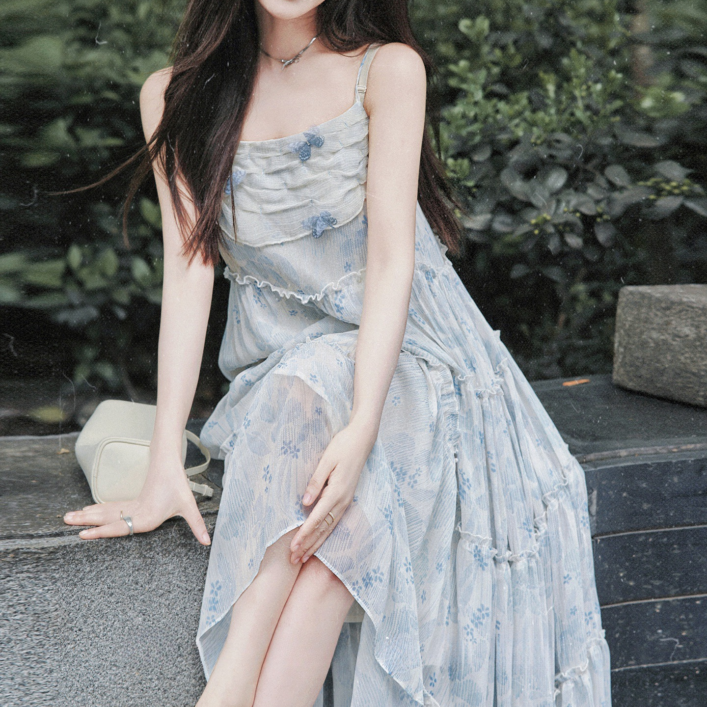 |仙海裙|休闲蓝色吊带裙夏季新款压褶中长款连衣裙
