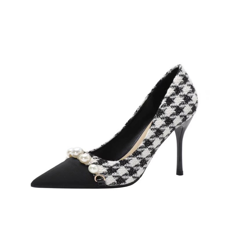 拼色千鸟格纹高跟鞋尖头珍珠一字带高跟单鞋浅口一脚蹬高跟鞋