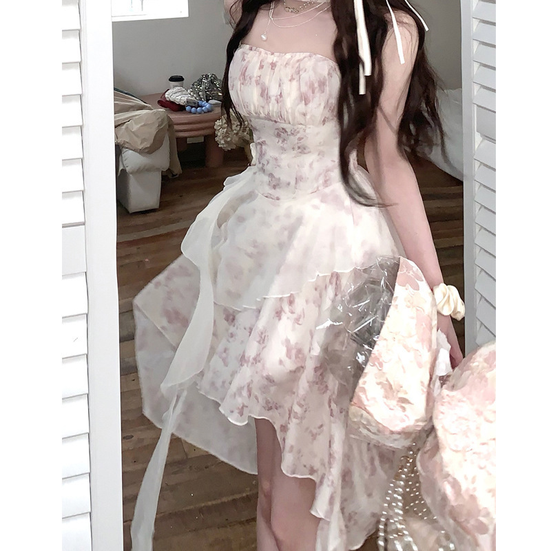新款夏季裙子雾桃仙子~春夏新款欲甜美显瘦碎花抹胸连衣裙