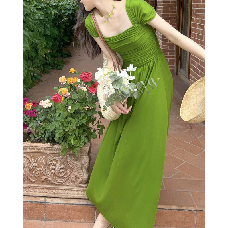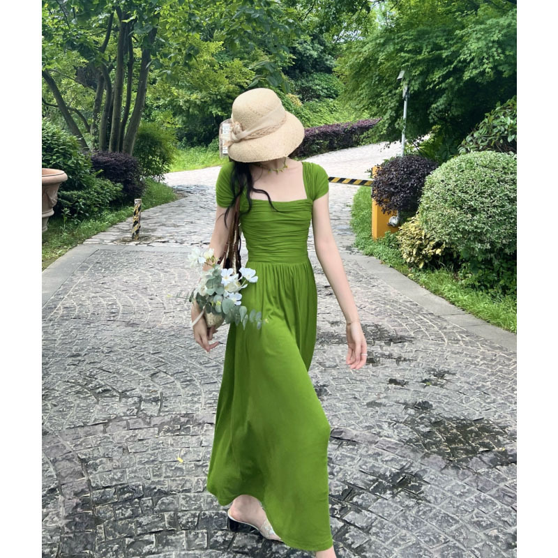 夏季新品方领修身绿色针织长裙显瘦气质度假风连衣裙芭蕾风裙子女
