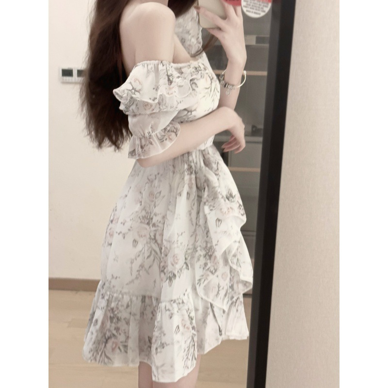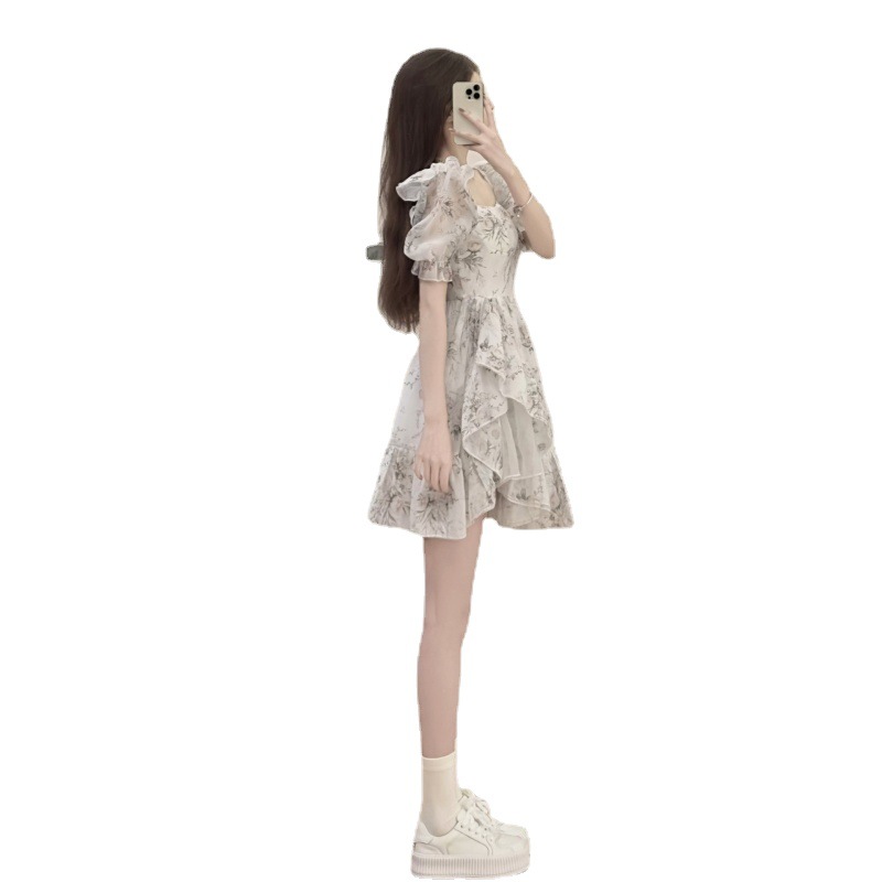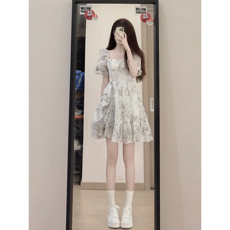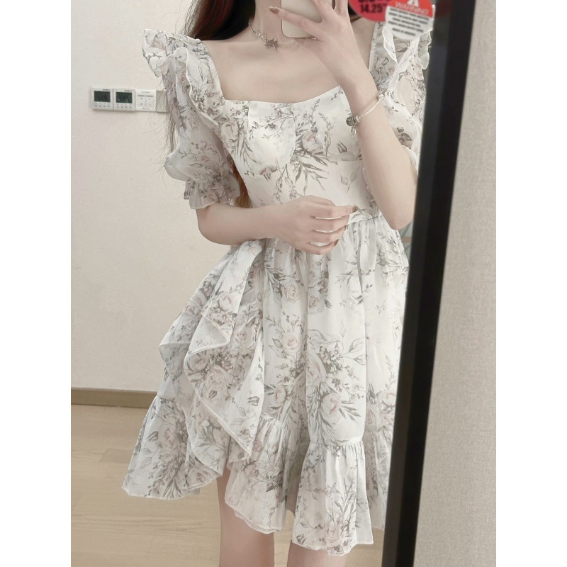时尚设计感蓬蓬裙女夏装新款茶歇法式碎花方领泡泡袖连衣裙