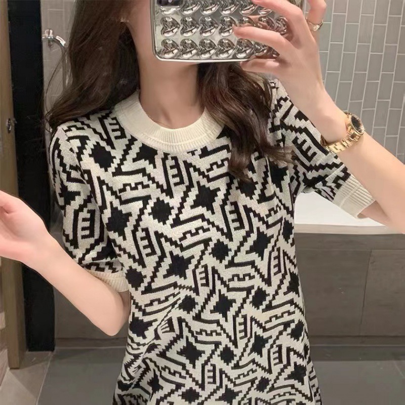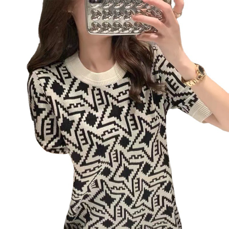 新款夏季赫本风复古时尚气质女神范黑白星星提花针织连衣裙女