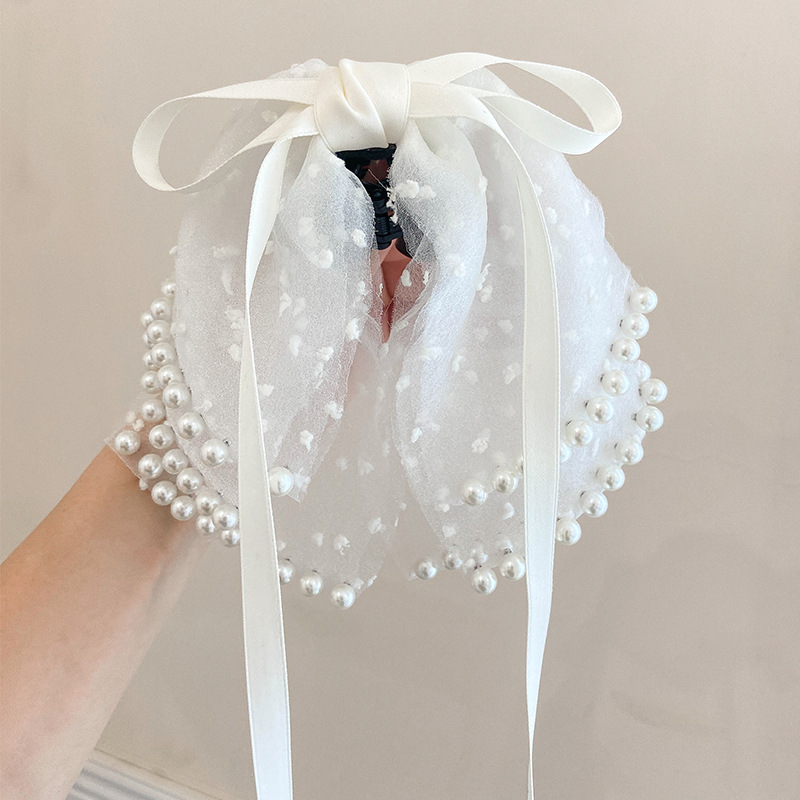 韩系温柔钉珍珠蝴蝶结马尾抓夹夏季公主风飘带气质半扎发鲨鱼夹子