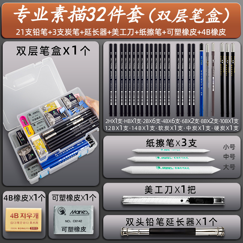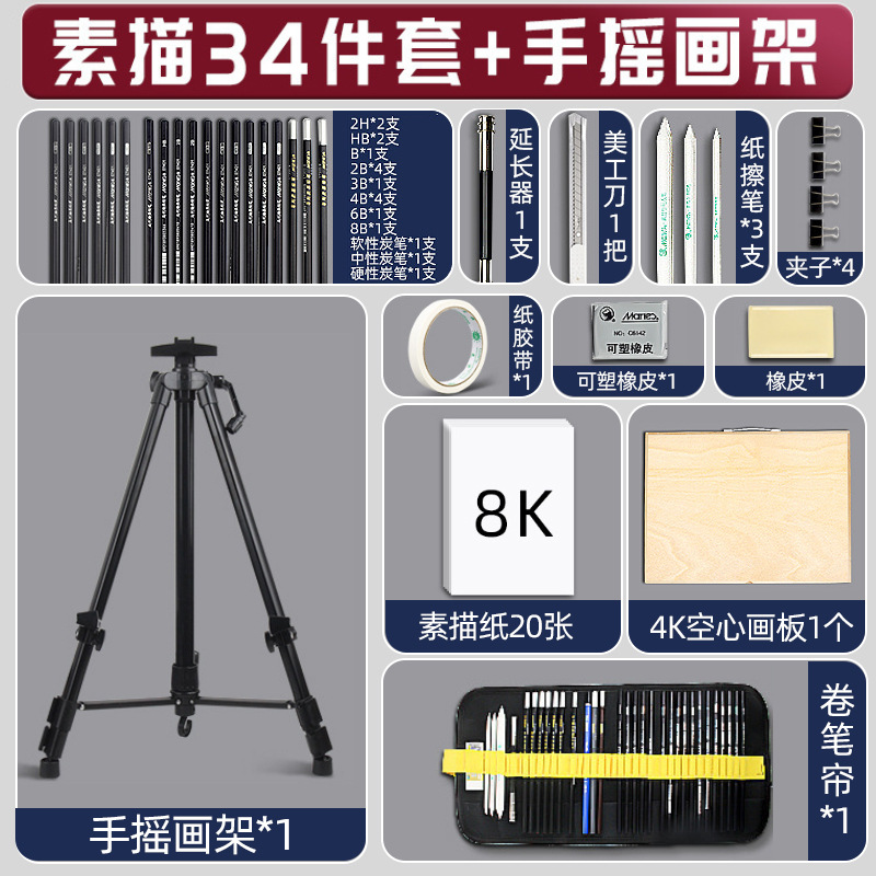 - 马利铅笔素描34件套-手摇画架-4K空心画板