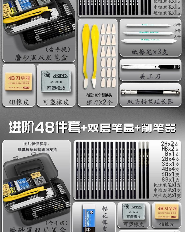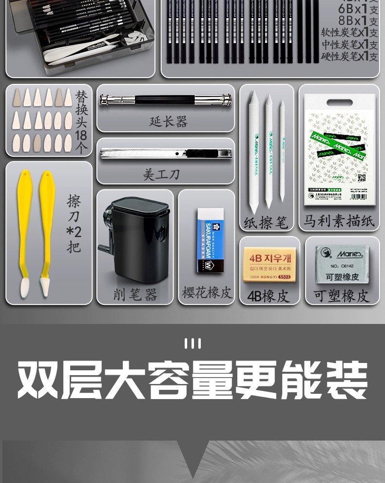 - 【素描削笔器+进阶46件】黑色双层笔盒