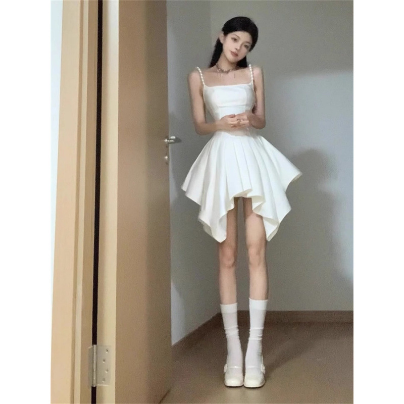 法式白色珍珠吊带连衣裙女夏季收腰显瘦不规则生日公主蓬蓬短裙子