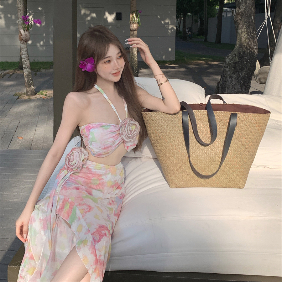 性感抹胸挂脖立体花朵高开叉长裙飘逸仙气粉色碎花海边度假两件套